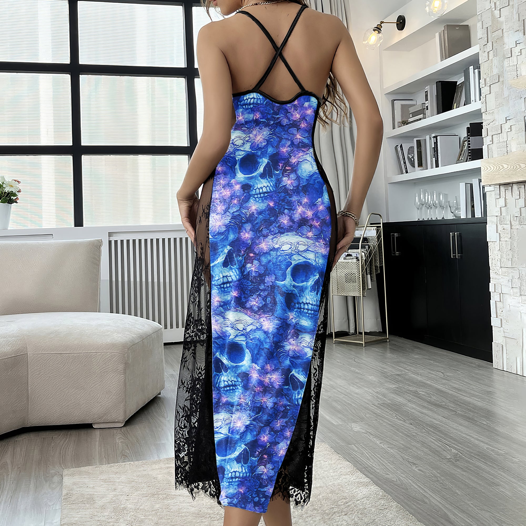 This stunning Abstract Flower Skull Pattern lace nightgown features a unique skull rose pattern that adds a touch of edgy style to its feminine design. The cami style and cross back straps ensure a comfortable and flattering fit, while the soft lace material feels gentle against your skin. This women's nightgown is perfect for a restful night's sleep or for lounging around the house. Its understated elegance and edgy design make it a versatile addition to your sleepwear collection. Whether you're treating yourself or looking for a thoughtful gift, this Abstract Flower Skull Pattern lace nightgown is a great choice that any woman will love.