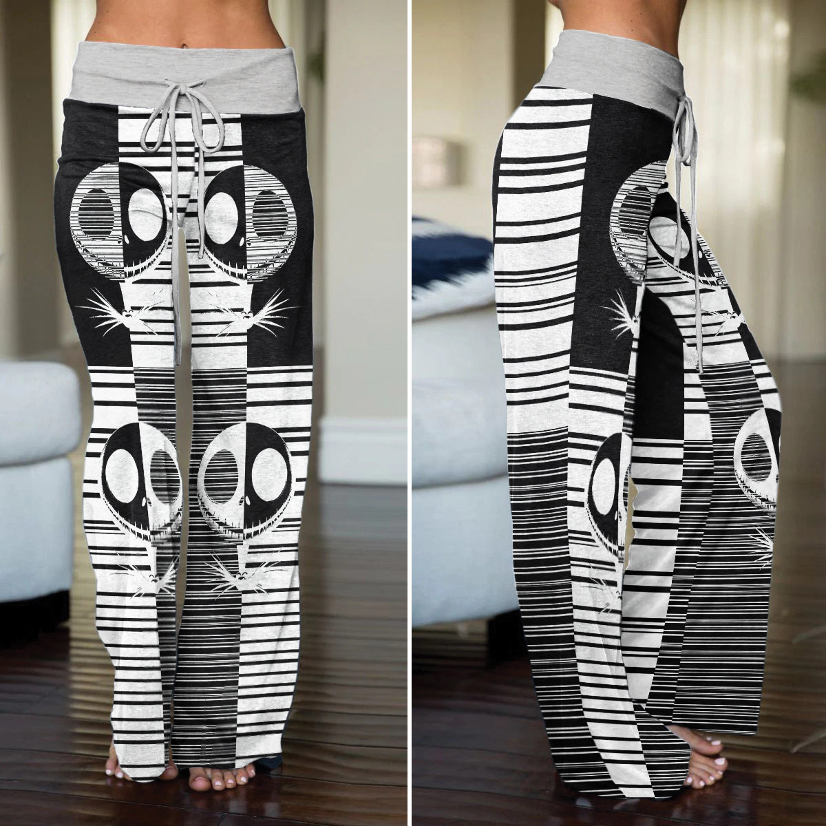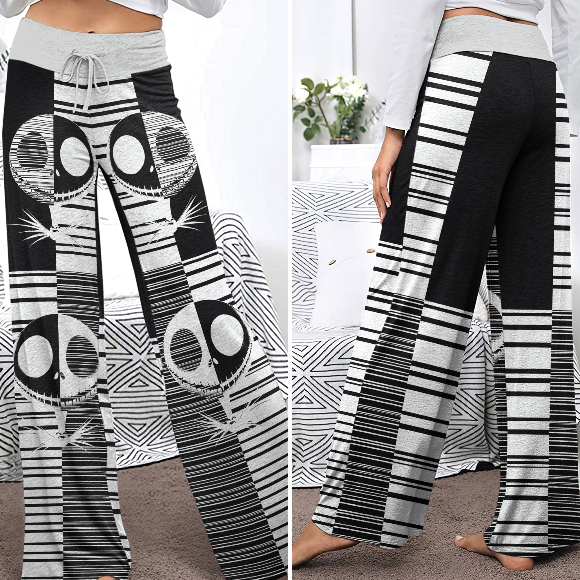 Enjoy the comfort and quality of the Black & White Nightmare Art High-waisted Wide Leg Pants. Constructed from a premium lightweight fabric, it offers unlimited movement, along with a unique and stylish pattern. It features a wide waistband for a streamlined and flattering fit. Perfect for any occasion, these trousers provide the perfect blend of classic style and modern design.