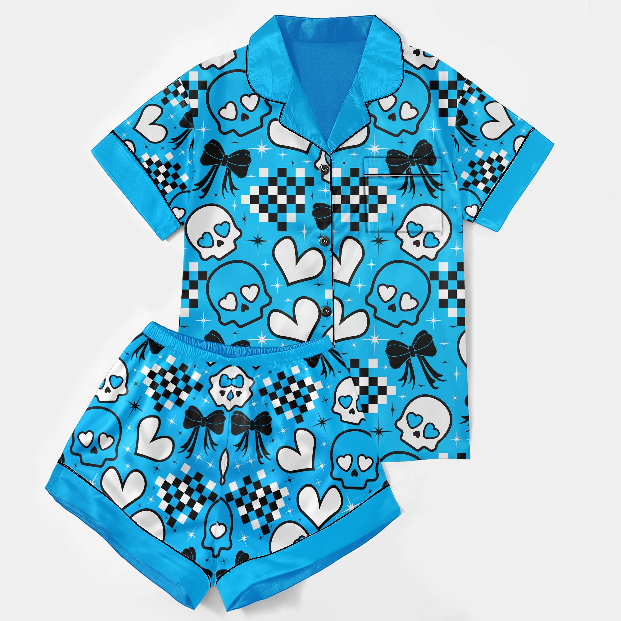 Blue Heart Skull Women's Pajama Sets Top Sleeve & Short Bottom