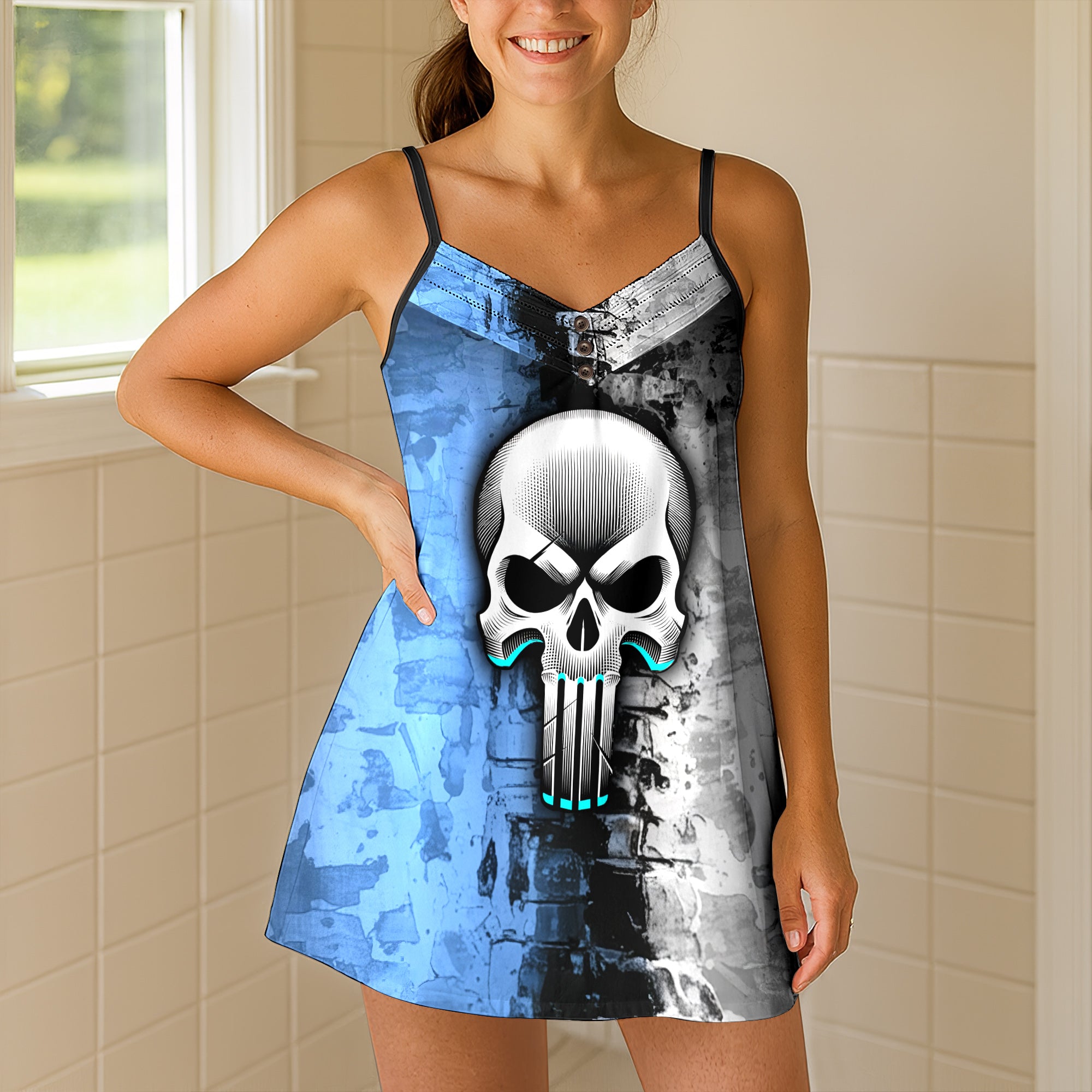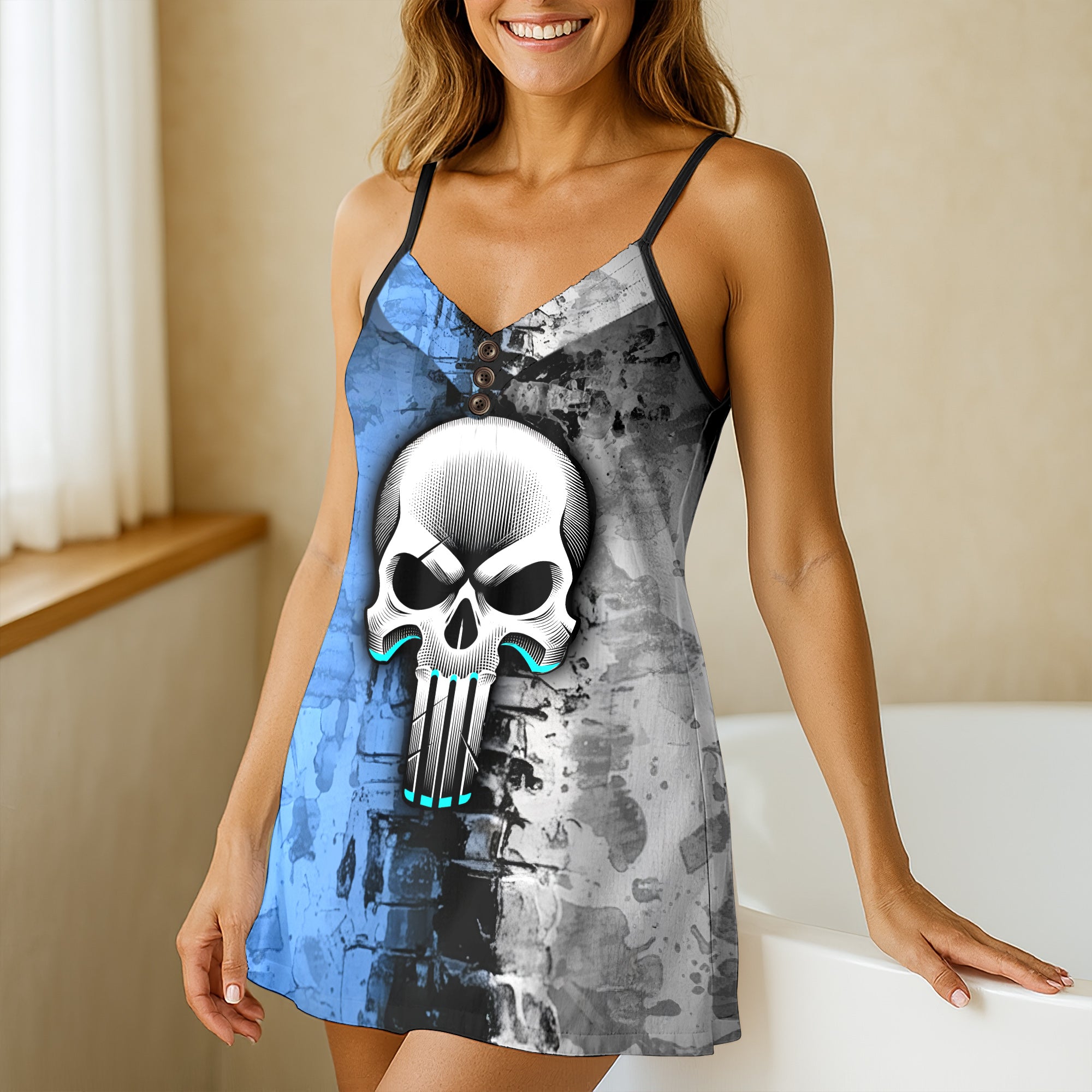 Unleash your inner goddess with this versatile cami dress. It features a stunning Wonder Skull Blue Grunge Skull design on a feather-light, breathable fabric for airy comfort. The flattering A-line silhouette, adjustable spaghetti straps, and vintage three-button accent create a devastatingly chic look. Perfect as a head-turning sundress or a seductive nightgown, this dress is your secret weapon for any occasion.