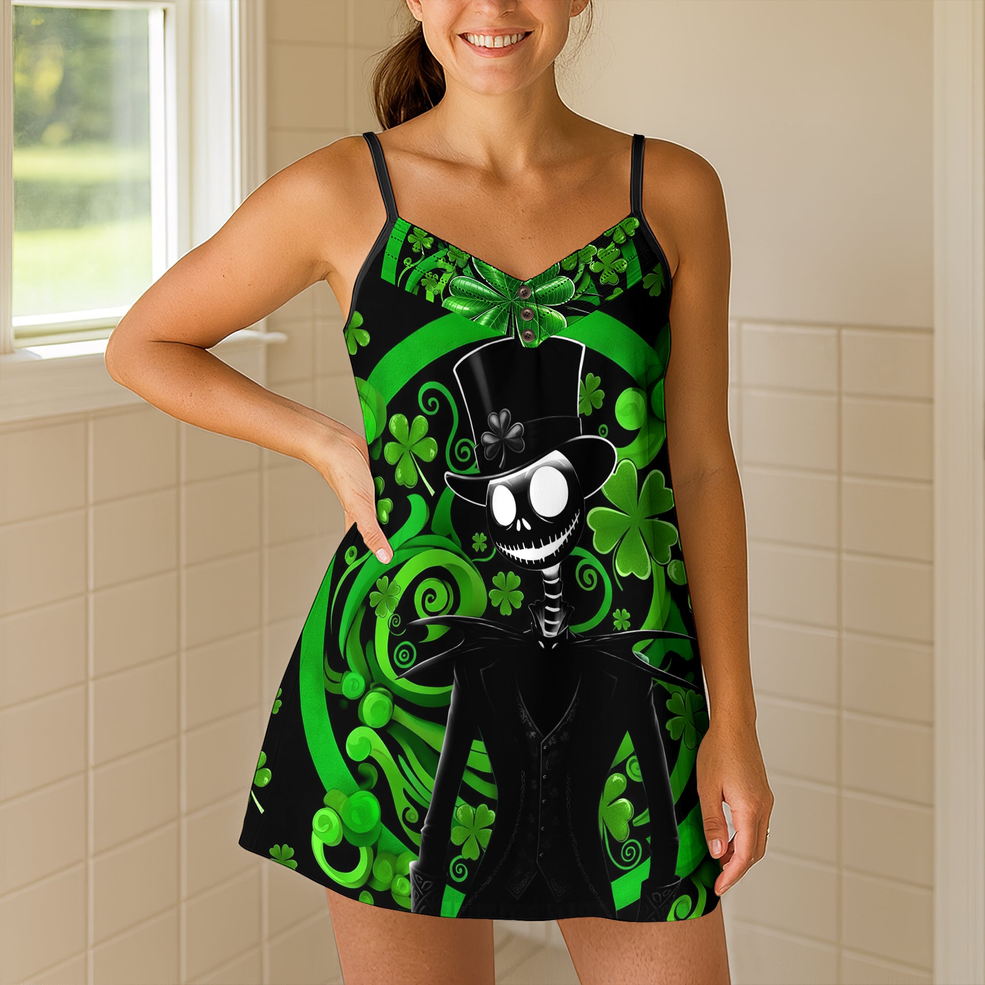 Unleash your inner goddess in this stunning green goth clover pattern cami dress—perfect for slaying day and night.