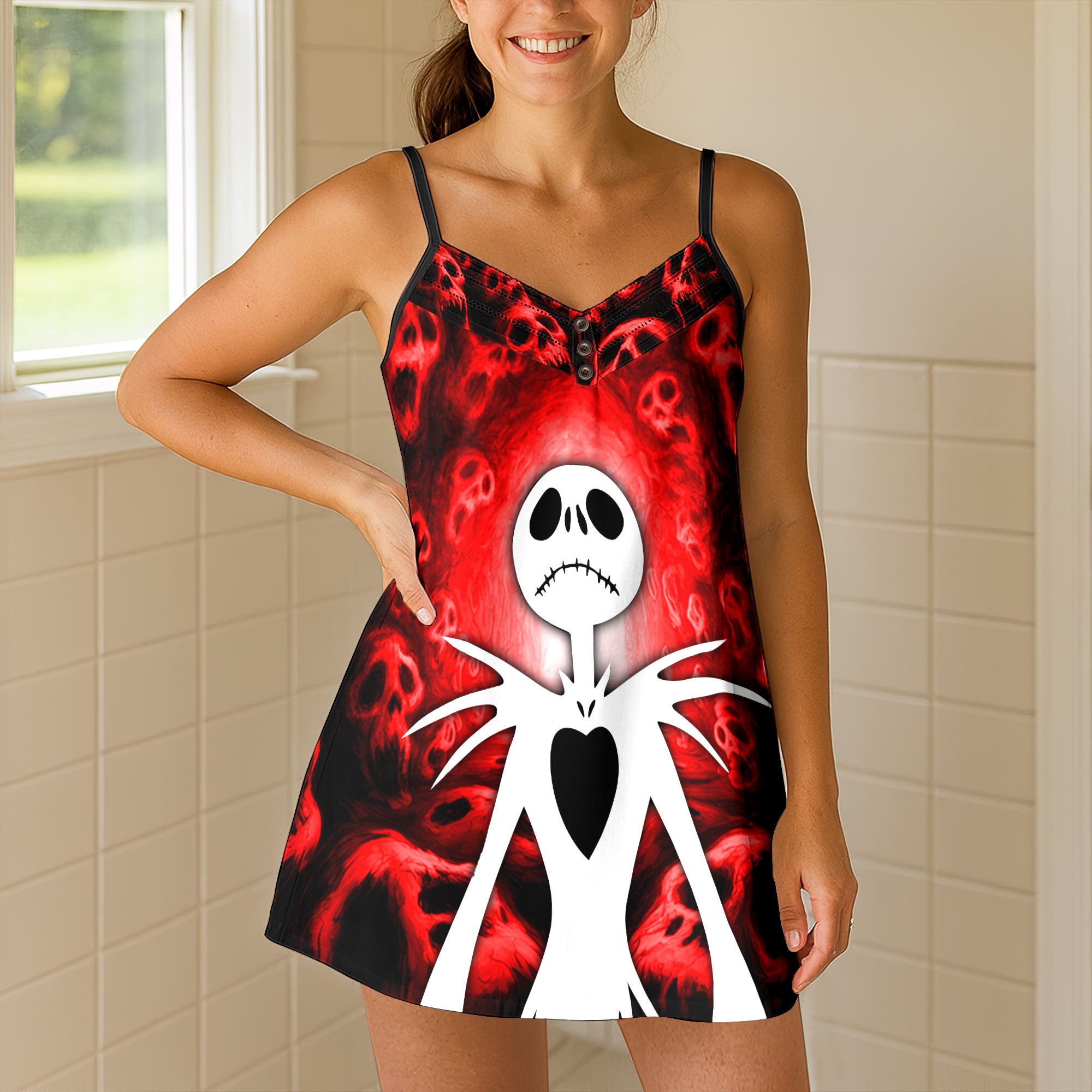 Unleash your inner goddess with this versatile cami dress. It features a stunning Wonder Skull Grinning Shadow Skull design on a feather-light, breathable fabric for airy comfort. The flattering A-line silhouette, adjustable spaghetti straps, and vintage three-button accent create a devastatingly chic look. Perfect as a head-turning sundress or a seductive nightgown, this dress is your secret weapon for any occasion.