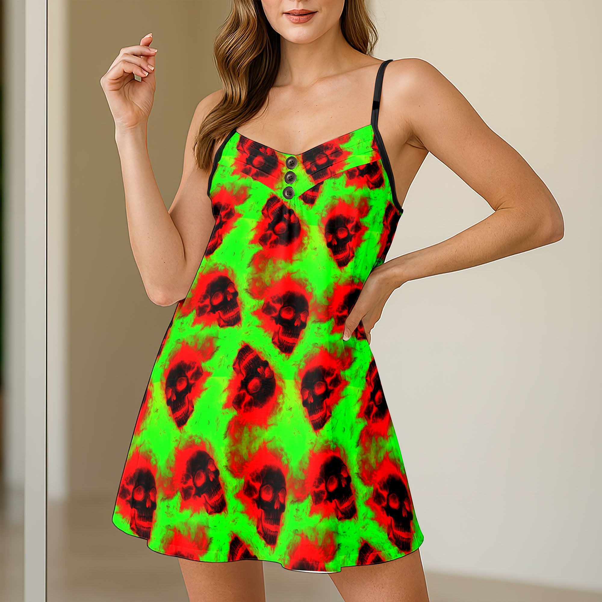 Unleash your inner goddess with this versatile cami dress. It features a stunning Wonder Skull Radioactive Skull Wave design on a feather-light, breathable fabric for airy comfort. The flattering A-line silhouette, adjustable spaghetti straps, and vintage three-button accent create a devastatingly chic look. Perfect as a head-turning sundress or a seductive nightgown, this dress is your secret weapon for any occasion.