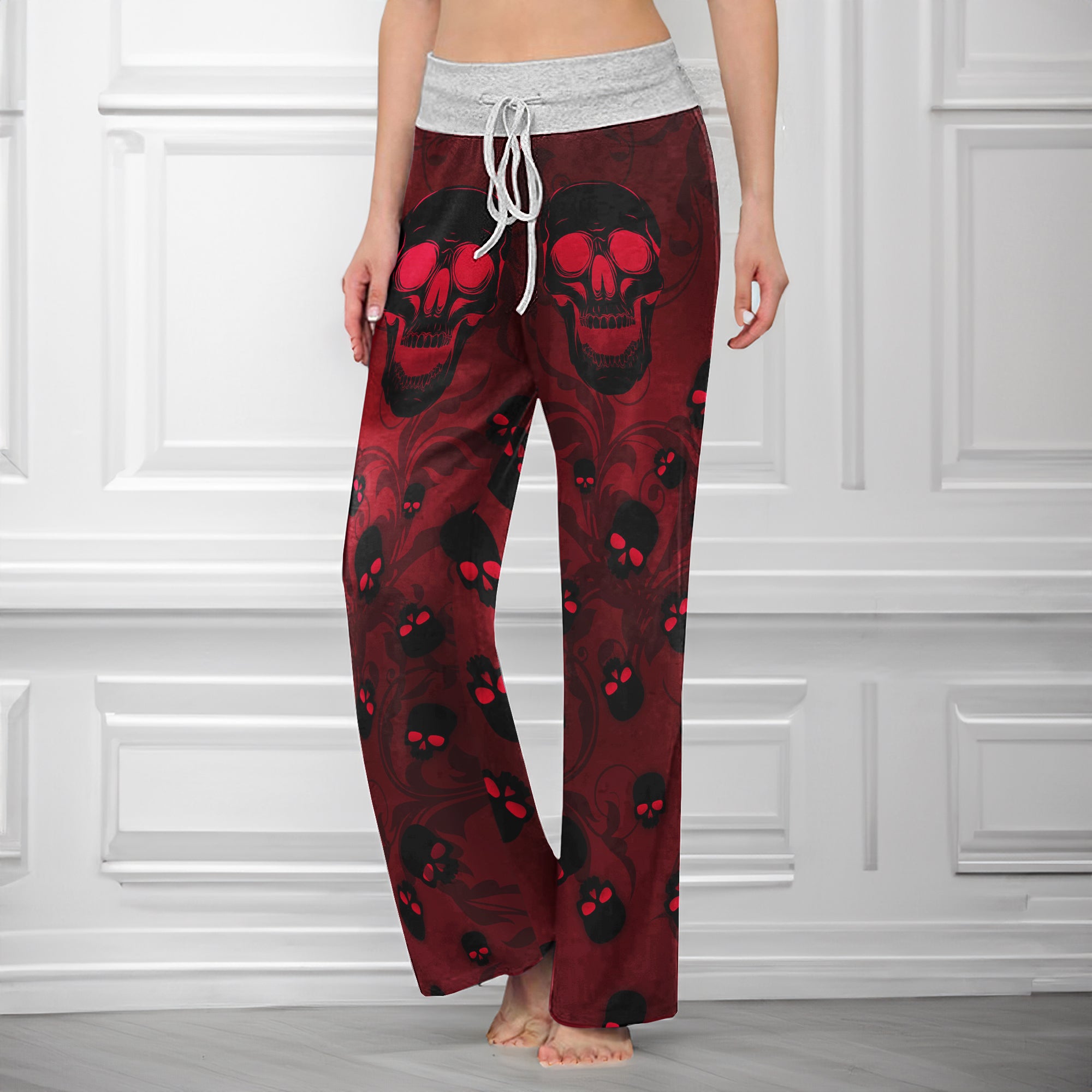 Dark Red Skull Pattern Women's High-waisted Wide Leg Pants | Wonder Skull