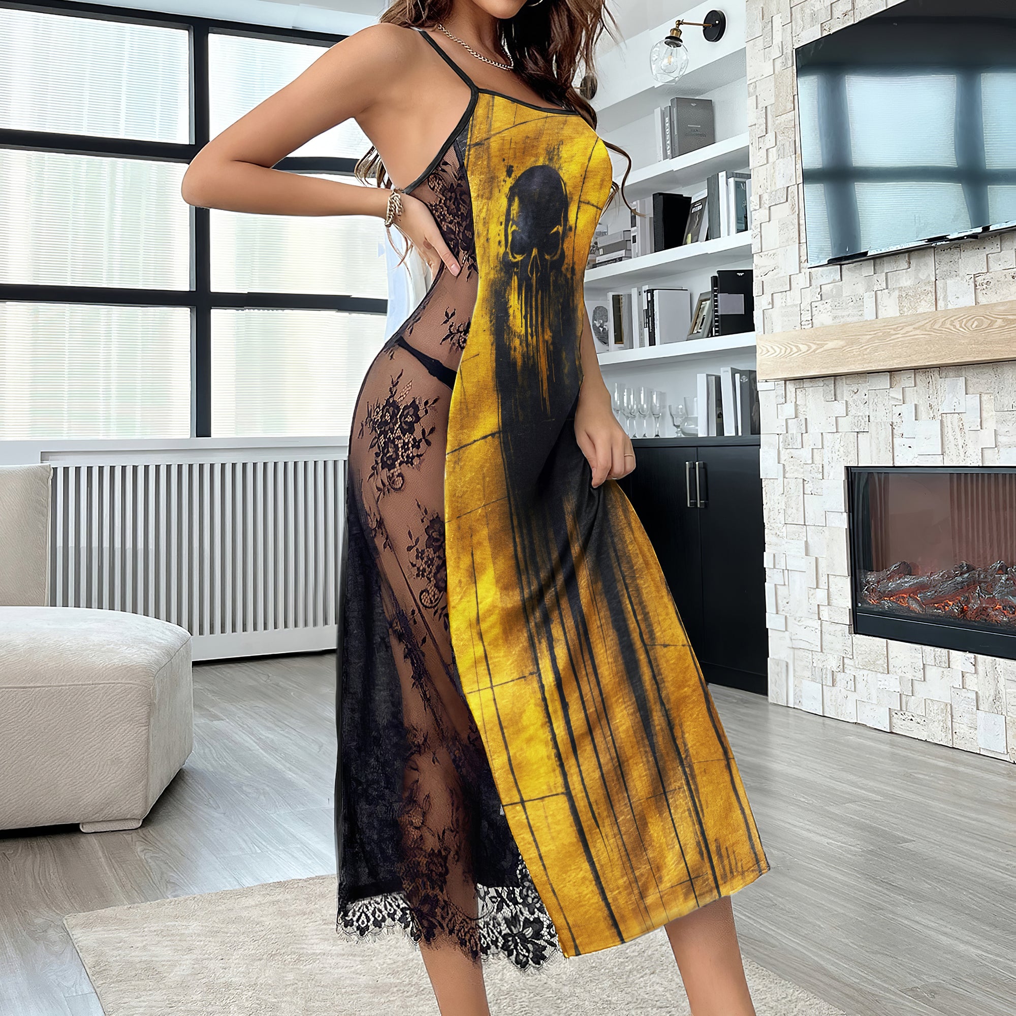This stunning Golden Skull Decay lace nightgown features a unique skull rose pattern that adds a touch of edgy style to its feminine design. The cami style and cross back straps ensure a comfortable and flattering fit, while the soft lace material feels gentle against your skin. This women's nightgown is perfect for a restful night's sleep or for lounging around the house. Its understated elegance and edgy design make it a versatile addition to your sleepwear collection. Whether you're treating yourself or looking for a thoughtful gift, this Golden Skull Decay lace nightgown is a great choice that any woman will love.