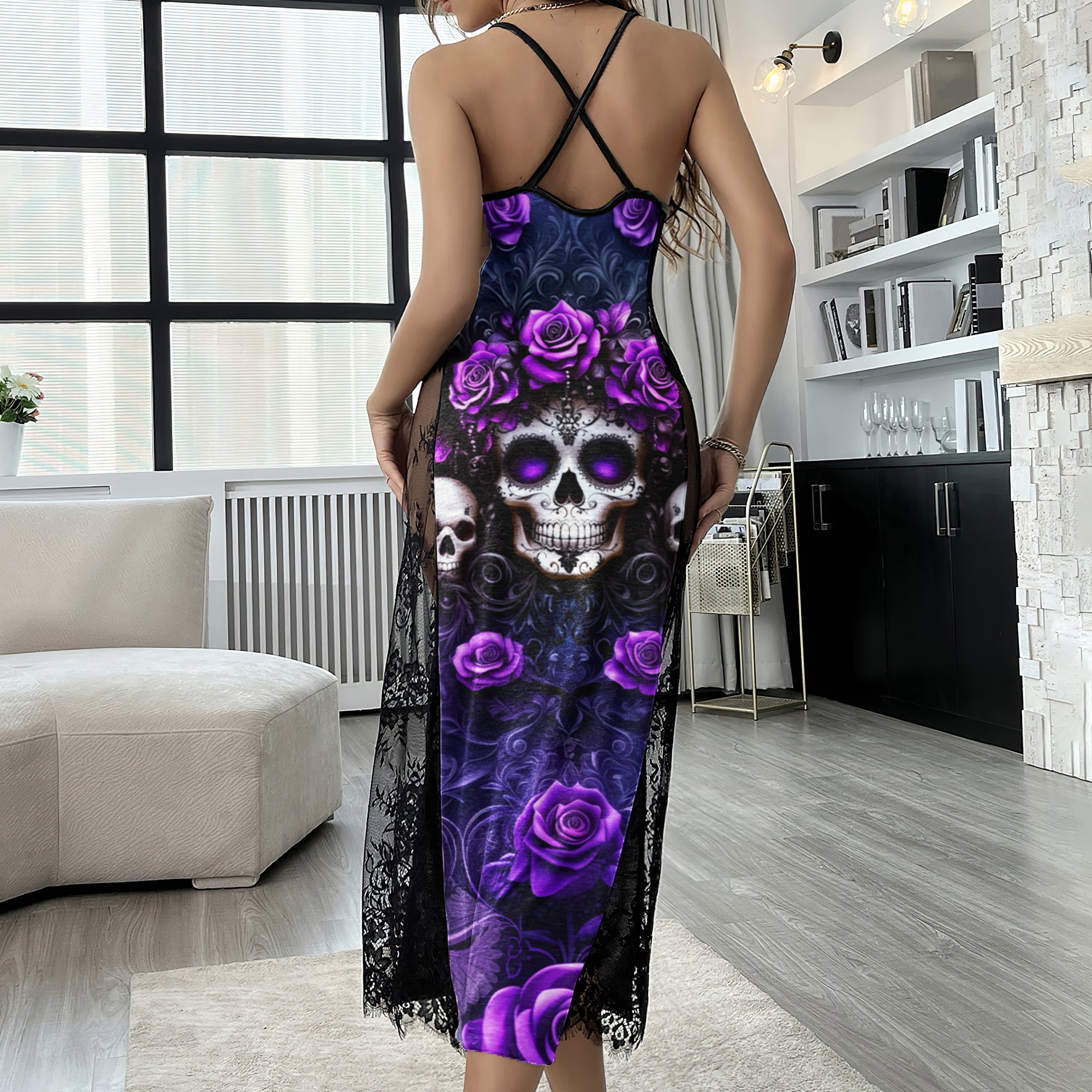This stunning Gothic Purple Skull Rose lace nightgown features a unique skull rose pattern that adds a touch of edgy style to its feminine design. The cami style and cross back straps ensure a comfortable and flattering fit, while the soft lace material feels gentle against your skin. This women's nightgown is perfect for a restful night's sleep or for lounging around the house. Its understated elegance and edgy design make it a versatile addition to your sleepwear collection. Whether you're treating yourself or looking for a thoughtful gift, this Gothic Purple Skull Rose lace nightgown is a great choice that any woman will love.