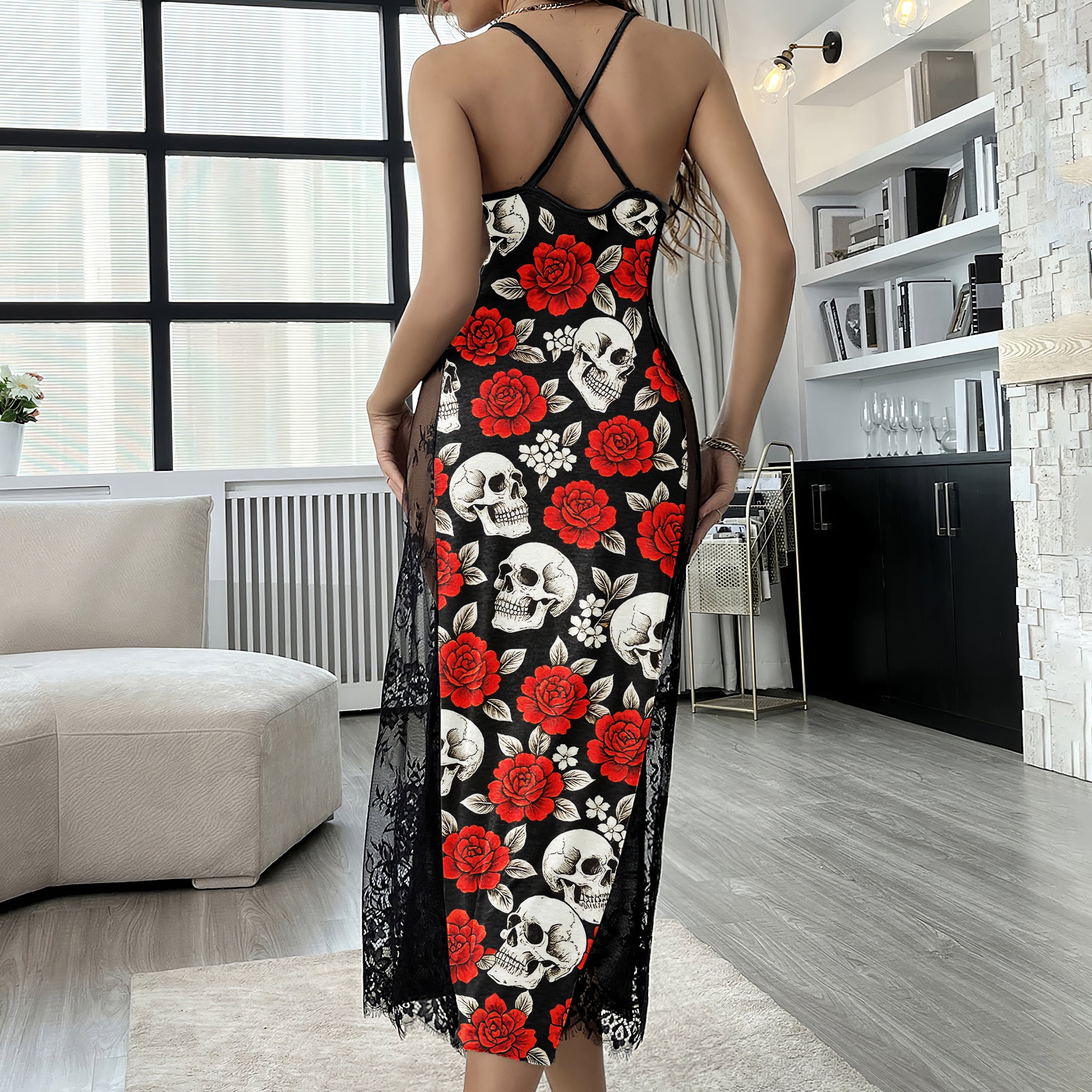 This stunning Gothic Skull Flower lace nightgown features a unique skull rose pattern that adds a touch of edgy style to its feminine design. The cami style and cross back straps ensure a comfortable and flattering fit, while the soft lace material feels gentle against your skin. This women's nightgown is perfect for a restful night's sleep or for lounging around the house. Its understated elegance and edgy design make it a versatile addition to your sleepwear collection. Whether you're treating yourself or looking for a thoughtful gift, this Gothic Skull Flower lace nightgown is a great choice that any woman will love.