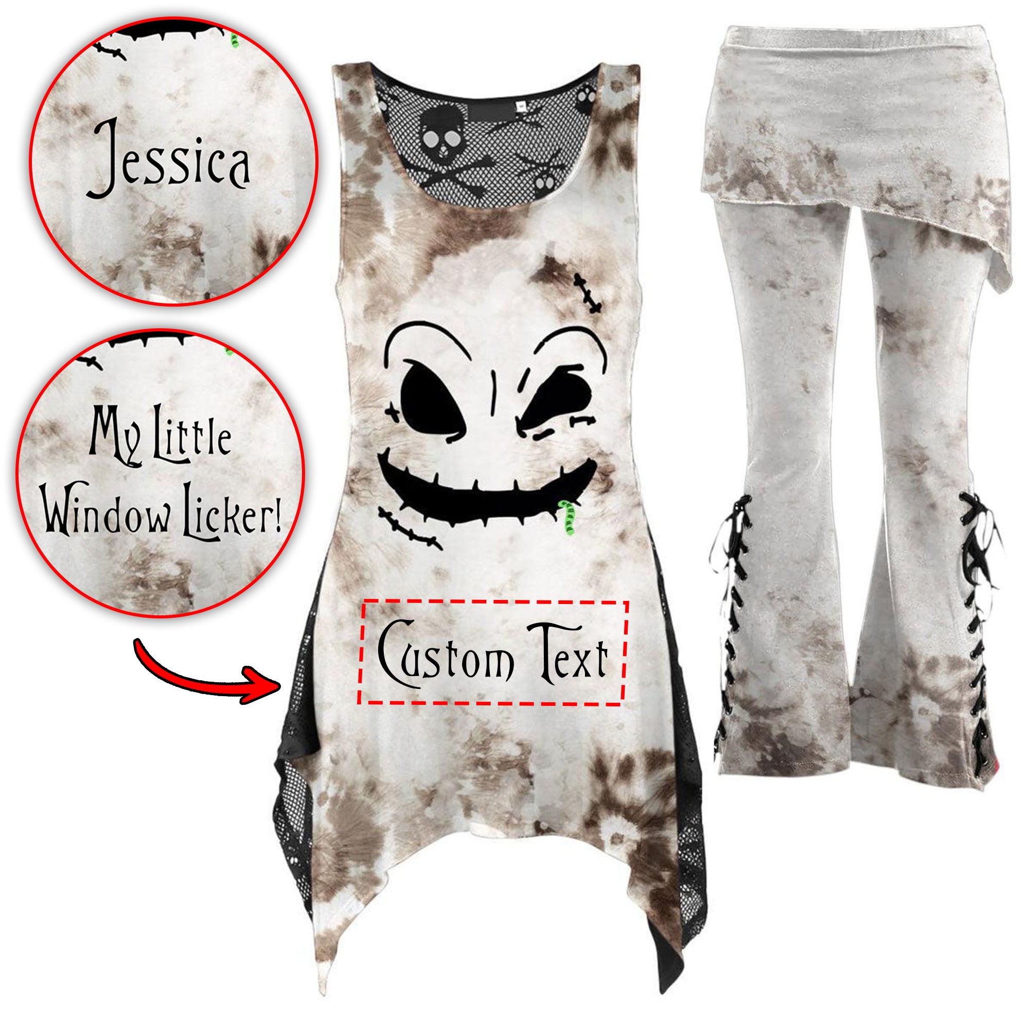Looking for an edgy and unique addition to your wardrobe? Look no further than our Gothic Skull Lace Tank Top and Flare Skirt Pants! The back of the tank top features a striking skull and crossbones lace design, while the attached mini high low skirt adds a touch of femininity. The flare pants are adorned with a trendy lace-up style on the side, and the light tie-dye brown and white print adds a touch of bohemian charm. Perfect for those who love to stand out from the crowd, this outfit is sure to turn heads. Shop now to add some edge to your style!