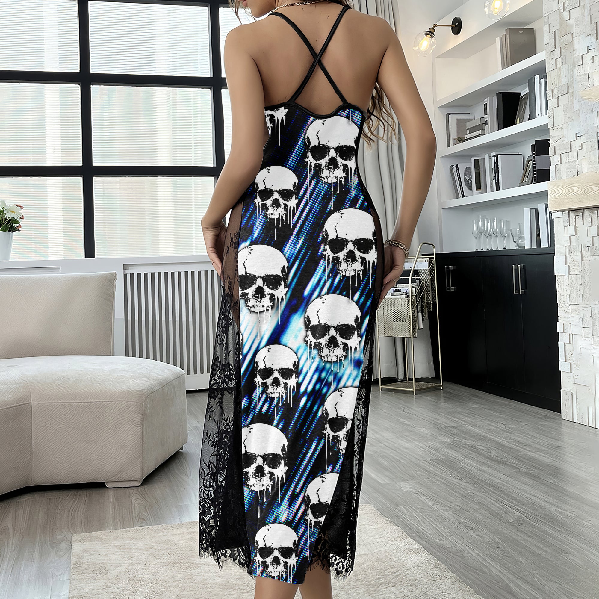 This stunning Neon Blue Skull Pattern lace nightgown features a unique skull rose pattern that adds a touch of edgy style to its feminine design. The cami style and cross back straps ensure a comfortable and flattering fit, while the soft lace material feels gentle against your skin. This women's nightgown is perfect for a restful night's sleep or for lounging around the house. Its understated elegance and edgy design make it a versatile addition to your sleepwear collection. Whether you're treating yourself or looking for a thoughtful gift, this Neon Blue Skull Pattern lace nightgown is a great choice that any woman will love.