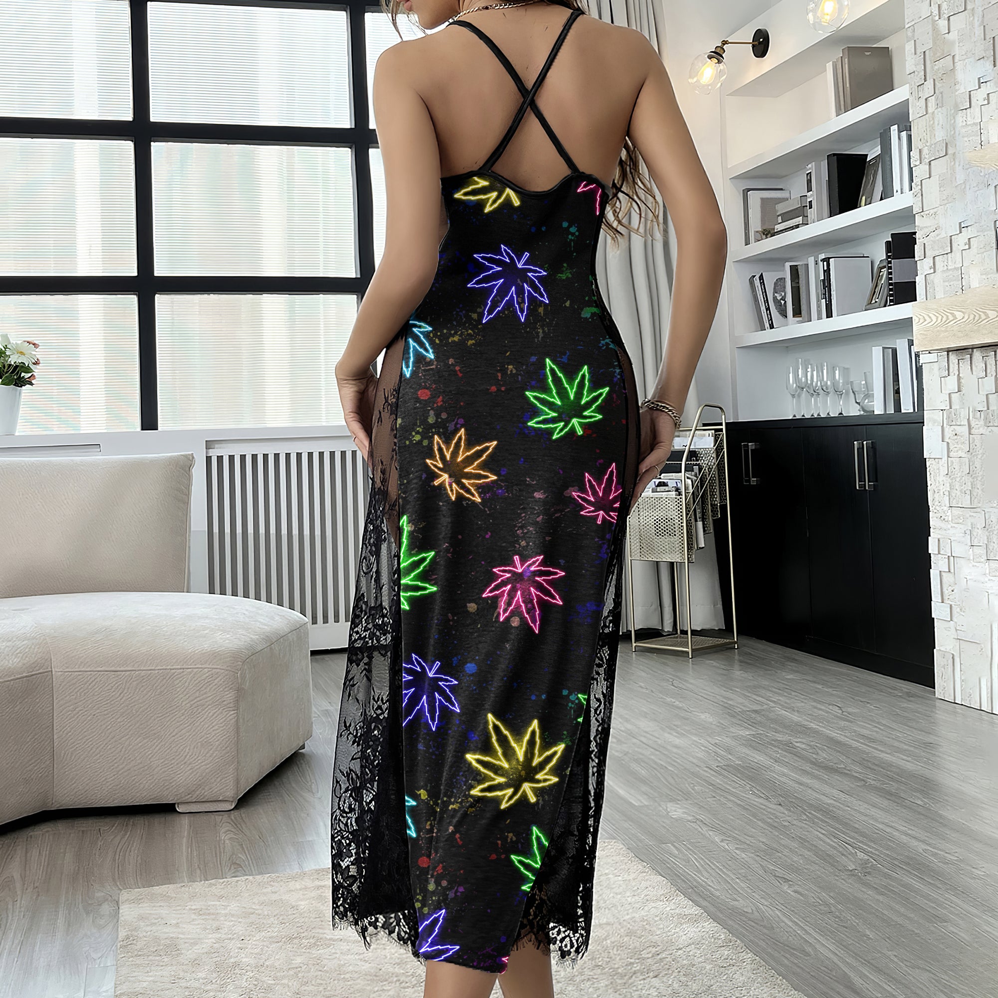 This stunning Neon Leaf Skull Pattern lace nightgown features a unique skull rose pattern that adds a touch of edgy style to its feminine design. The cami style and cross back straps ensure a comfortable and flattering fit, while the soft lace material feels gentle against your skin. This women's nightgown is perfect for a restful night's sleep or for lounging around the house. Its understated elegance and edgy design make it a versatile addition to your sleepwear collection. Whether you're treating yourself or looking for a thoughtful gift, this Neon Leaf Skull Pattern lace nightgown is a great choice that any woman will love.
