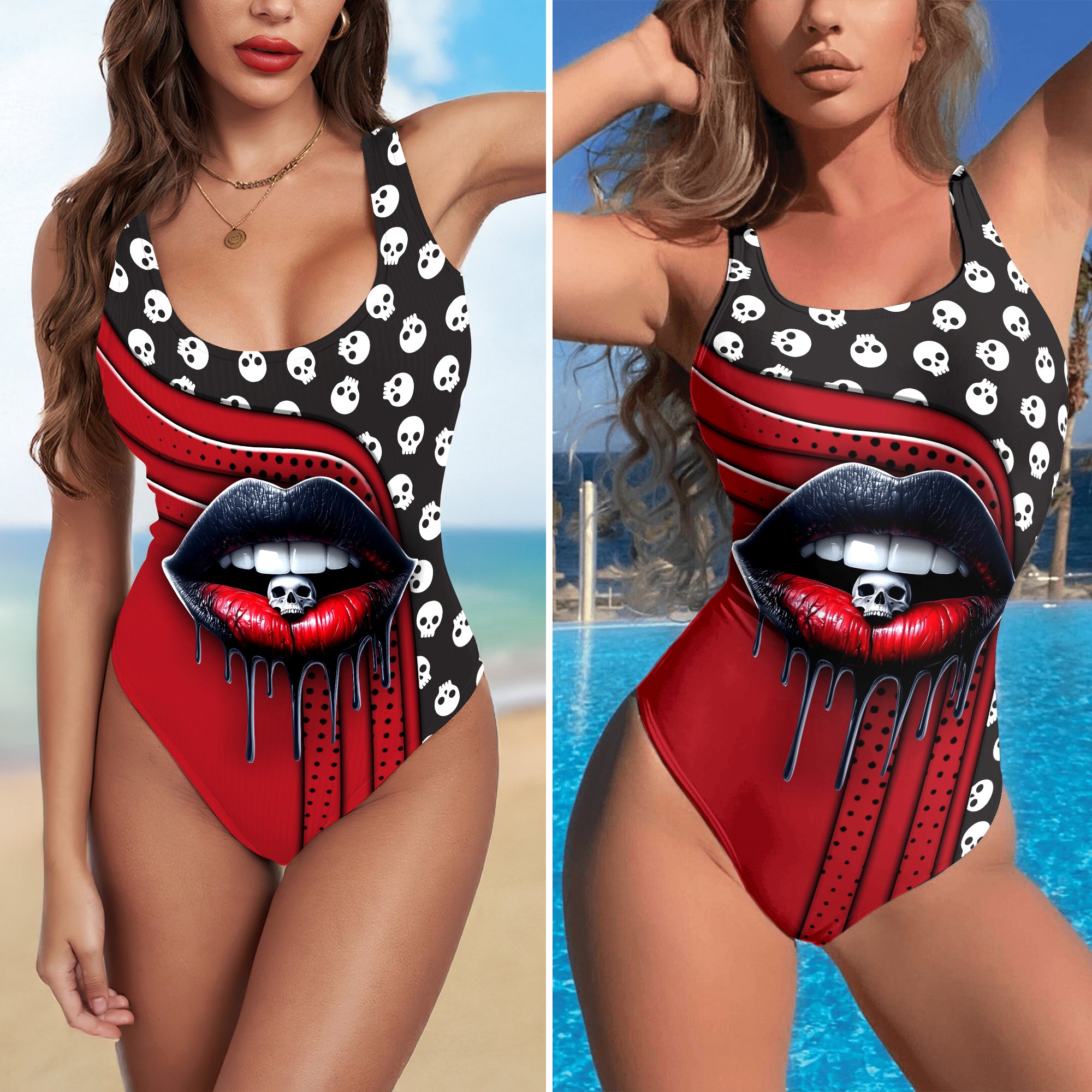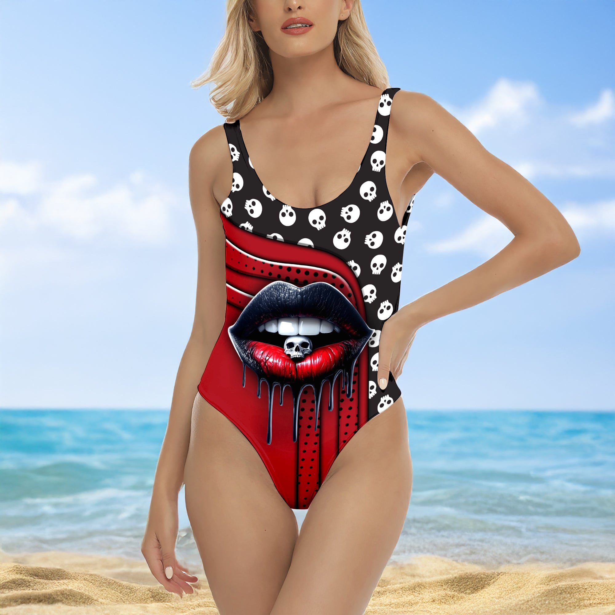 One Piece Bikini Black and Red Skull Lip Print Swimwear