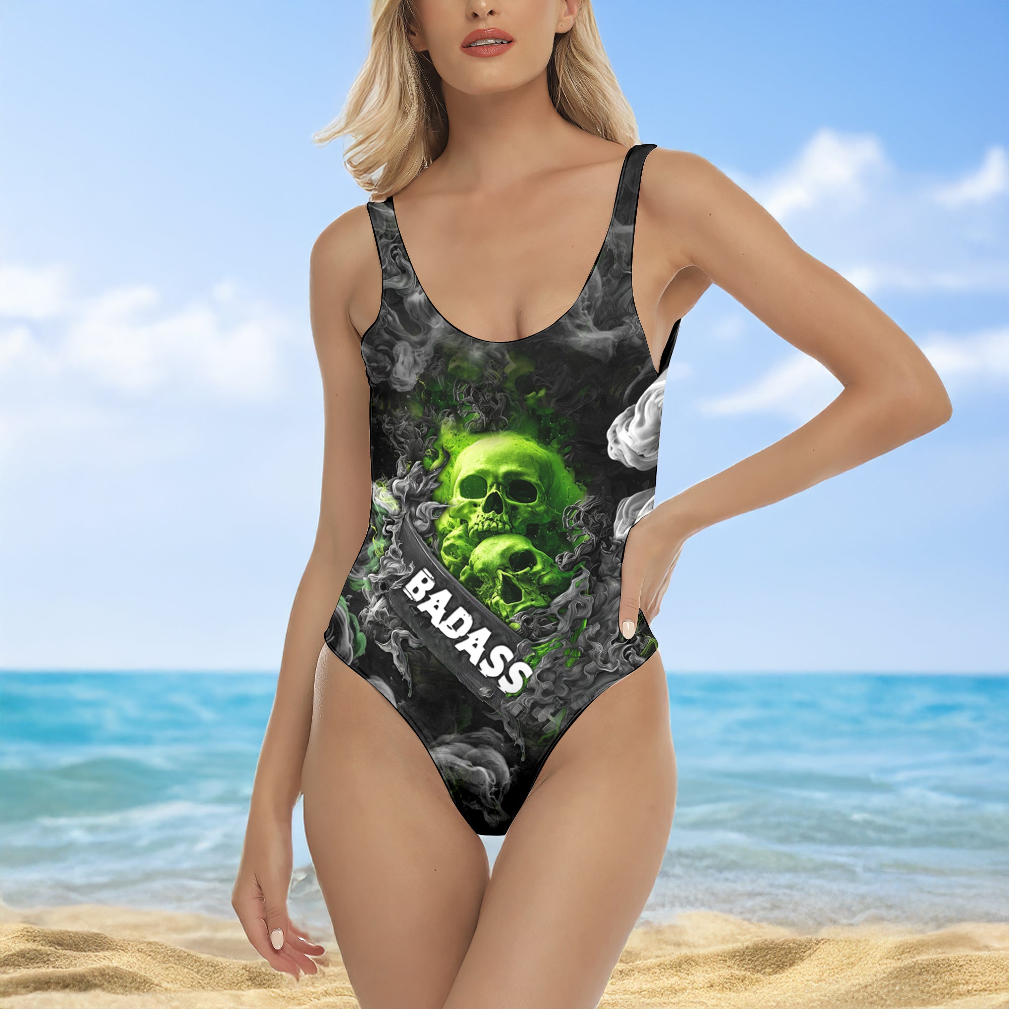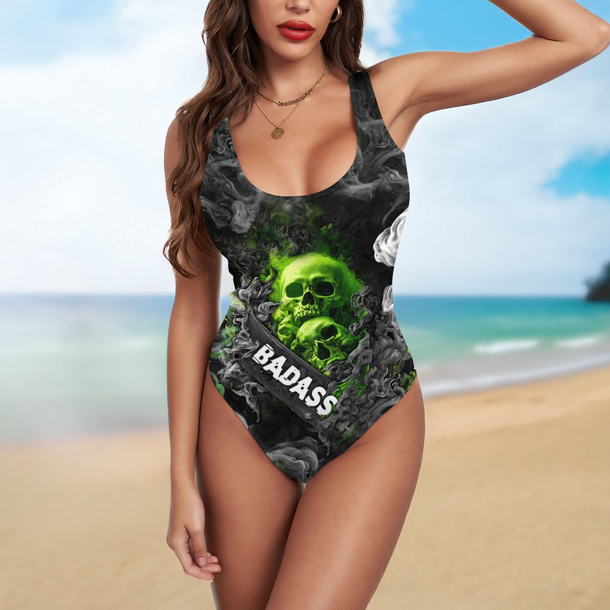 Get ready to shine in the sun with Wonder Skull One Piece Bikini Green Smoke Skull Print Swimwear. Perfect for the beach or poolside, this stylish one-piece swimsuit is designed to flatter all body types, offering a comfortable and confident fit. Featuring a glowing acid-green center radiates badass energy., this trendy swimwear adds a touch of elegance and charm, helping you stand out effortlessly. Made from soft, stretchy fabric, it provides all-day comfort and durability. Whether you're looking for a chic bikini for summer vacations or fashionable swimwear for lounging by the pool, this one-piece is a must-have for your wardrobe. Upgrade your swimwear collection today!