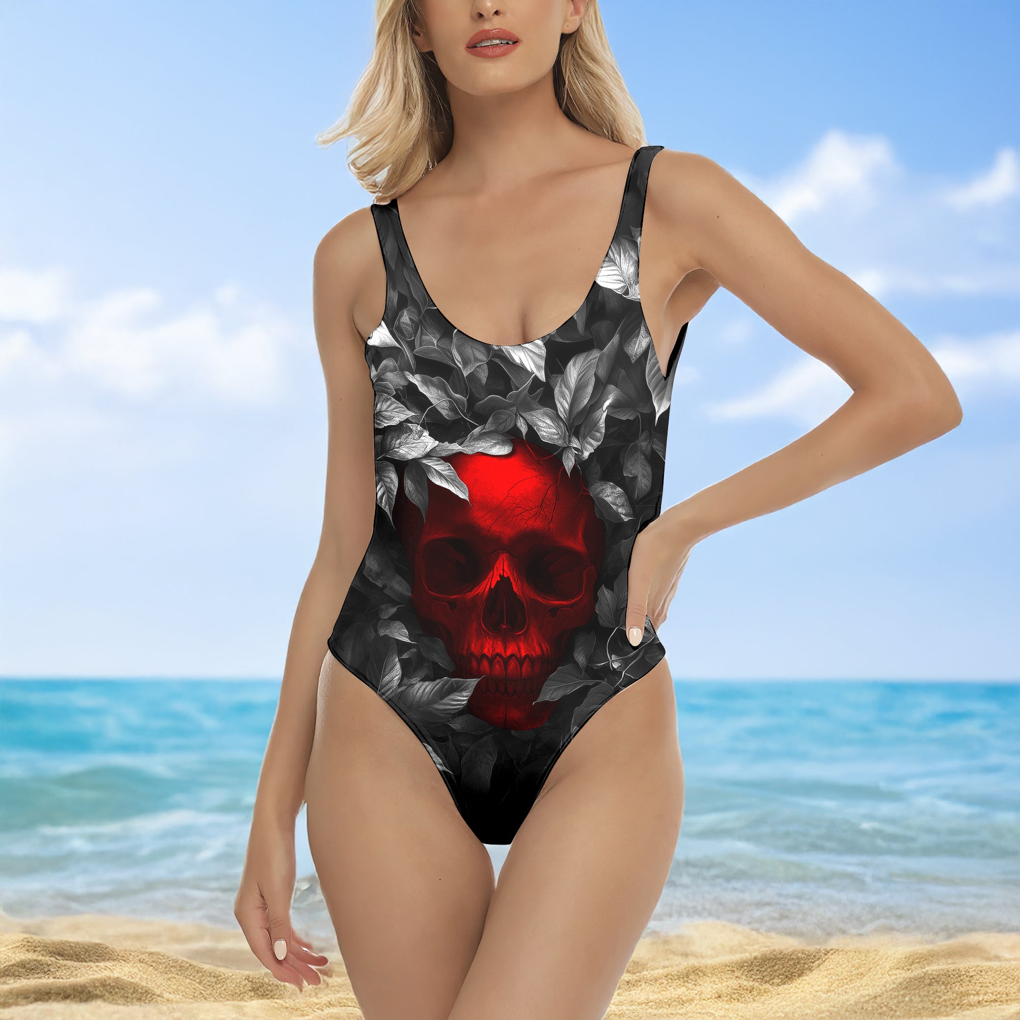 Get ready to shine in the sun with Wonder Skull One Piece Bikini Inferno Skull Leaf Print Swimwear. Perfect for the beach or poolside, this stylish one-piece swimsuit is designed to flatter all body types, offering a comfortable and confident fit. Featuring a fiery red skull enveloped by monochrome leaves, this trendy swimwear adds a touch of elegance and charm, helping you stand out effortlessly. Made from soft, stretchy fabric, it provides all-day comfort and durability. Whether you're looking for a chic bikini for summer vacations or fashionable swimwear for lounging by the pool, this one-piece is a must-have for your wardrobe. Upgrade your swimwear collection today!