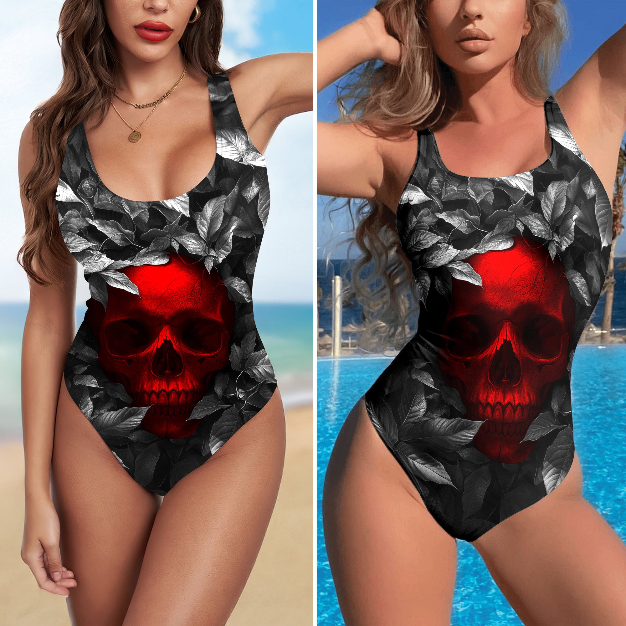 • Vibrant Colors: The swimsuit features a blazing inferno red skull that contrasts fiercely with the surrounding black-and-white leaf pattern