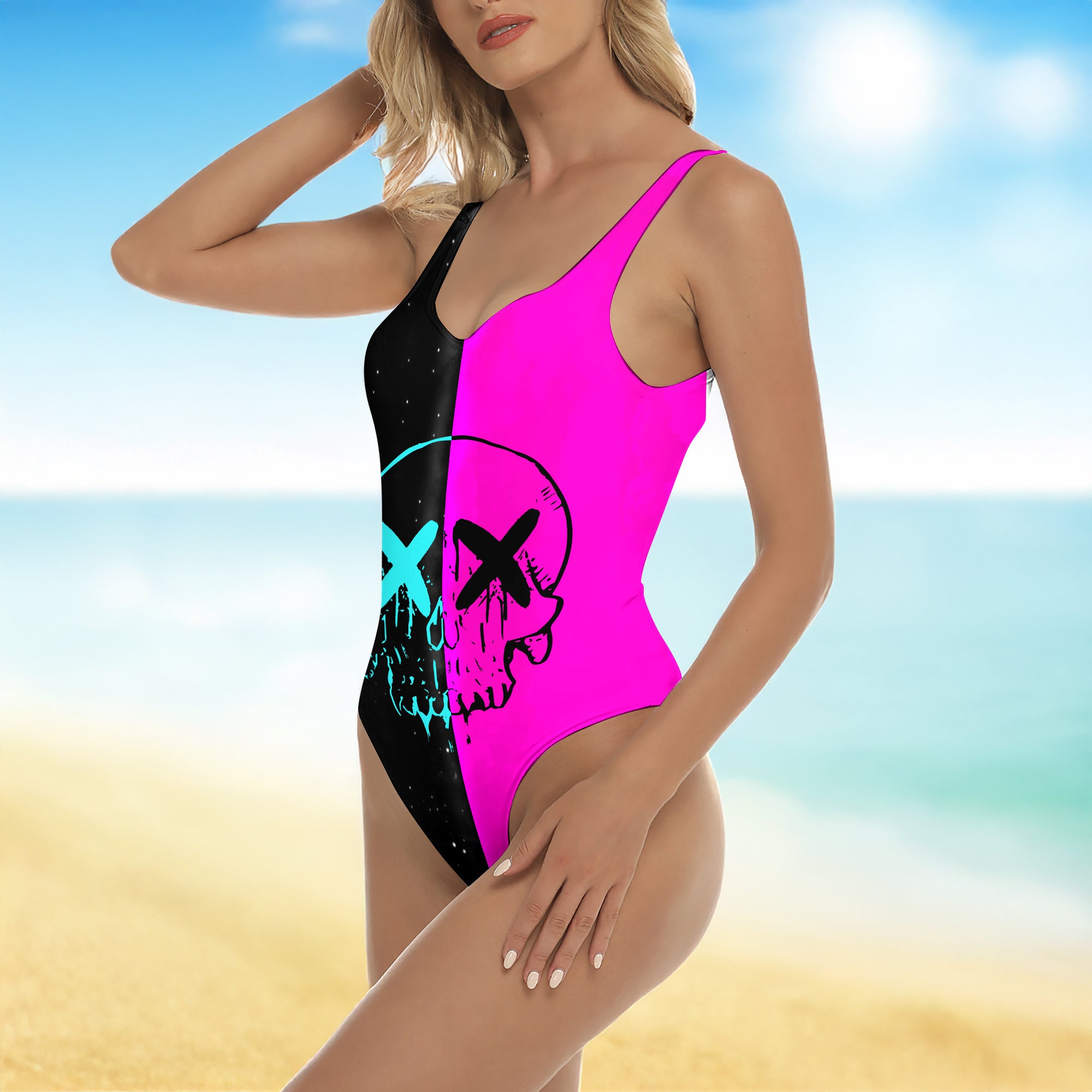 Get ready to shine in the sun with Wonder Skull One Piece Bikini Purple Neon Skull Grafiti Print Swimwear. Perfect for the beach or poolside, this stylish one-piece swimsuit is designed to flatter all body types, offering a comfortable and confident fit. Featuring a dripping skull graphic that screams style and danger, this trendy swimwear adds a touch of elegance and charm, helping you stand out effortlessly. Made from soft, stretchy fabric, it provides all-day comfort and durability. Whether you're looking for a chic bikini for summer vacations or fashionable swimwear for lounging by the pool, this one-piece is a must-have for your wardrobe. Upgrade your swimwear collection today!