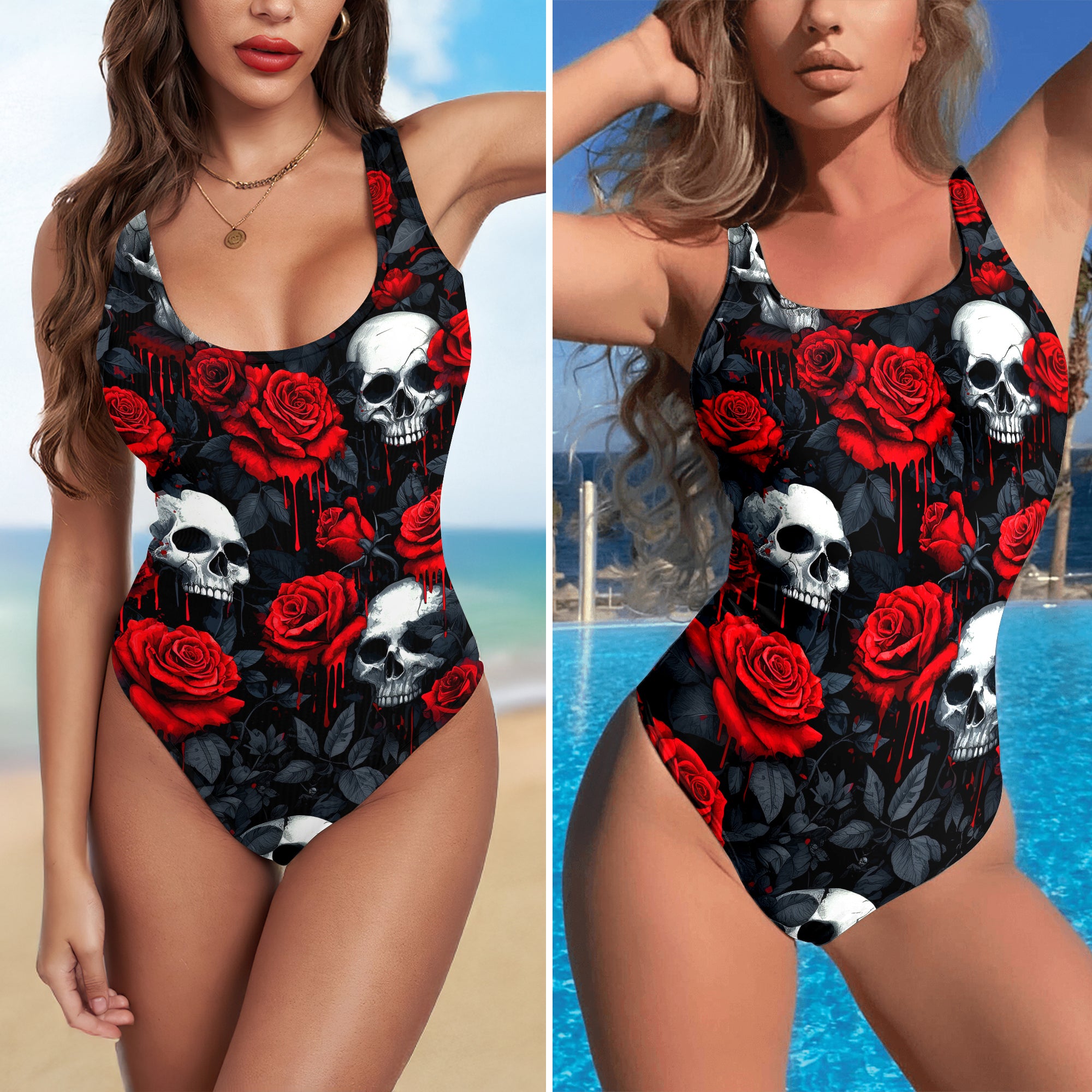 Get ready to shine in the sun with Wonder Skull One Piece Bikini Red Ruin Skull Bloom Print Swimwear. Perfect for the beach or poolside, this stylish one-piece swimsuit is designed to flatter all body types, offering a comfortable and confident fit. Featuring a bleeding over ghost-pale skulls nestled in deep charcoal leaves., this trendy swimwear adds a touch of elegance and charm, helping you stand out effortlessly. Made from soft, stretchy fabric, it provides all-day comfort and durability. Whether you're looking for a chic bikini for summer vacations or fashionable swimwear for lounging by the pool, this one-piece is a must-have for your wardrobe. Upgrade your swimwear collection today!