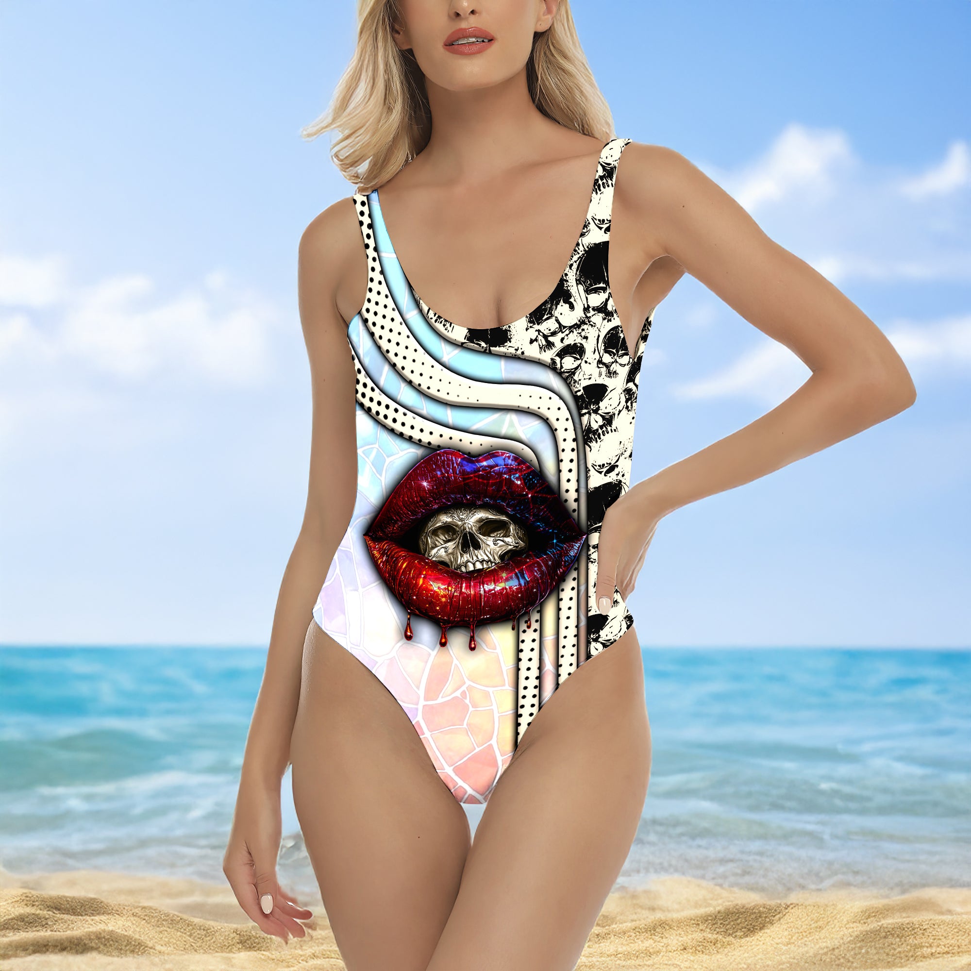 Get ready to shine in the sun with Wonder Skull One Piece Bikini Red Skull Kiss Bathing Print Swimwear. Perfect for the beach or poolside, this stylish one-piece swimsuit is designed to flatter all body types, offering a comfortable and confident fit. Featuring a surreal holographic mosaic background, abstract wave and polka-dot patterns., helping you stand out effortlessly. Made from soft, stretchy fabric, it provides all-day comfort and durability. Whether you're looking for a chic bikini for summer vacations or fashionable swimwear for lounging by the pool, this one-piece is a must-have for your wardrobe. Upgrade your swimwear collection today!