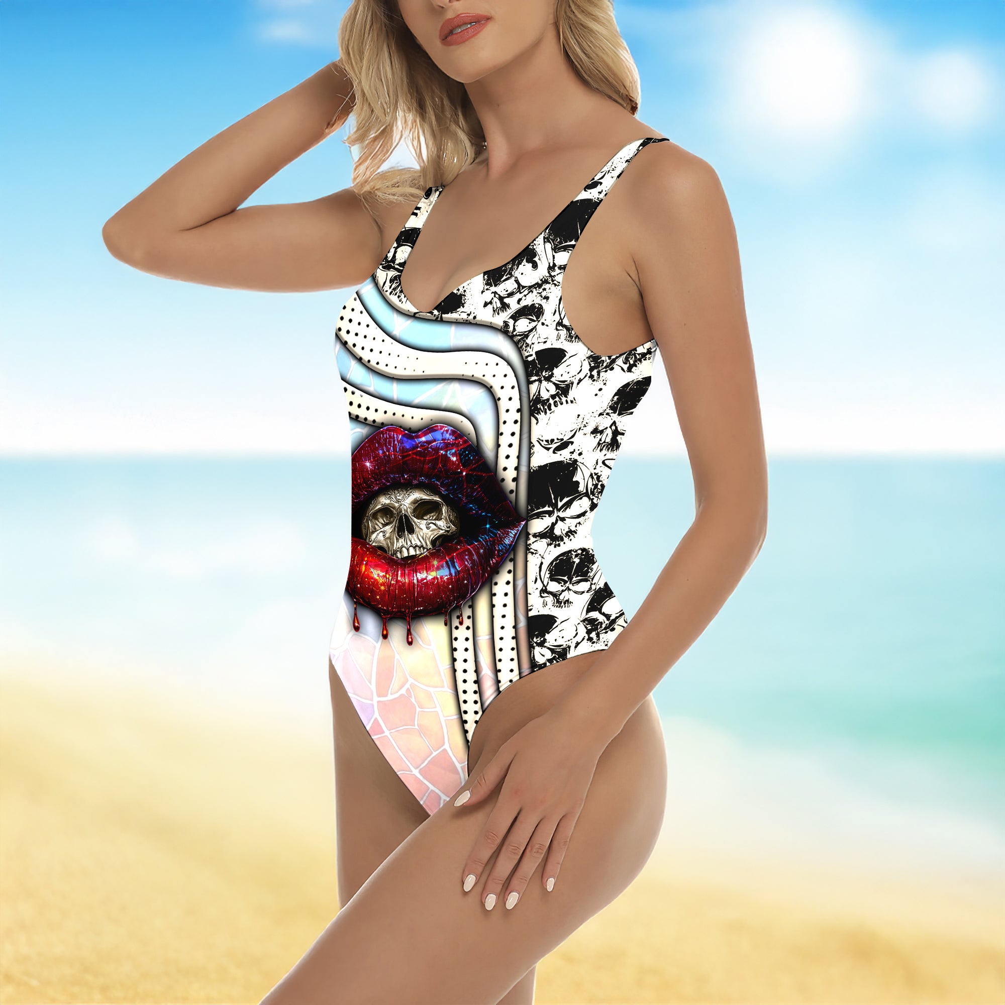 One Piece Bikini Red Skull Kiss Bathing Print Swimwear