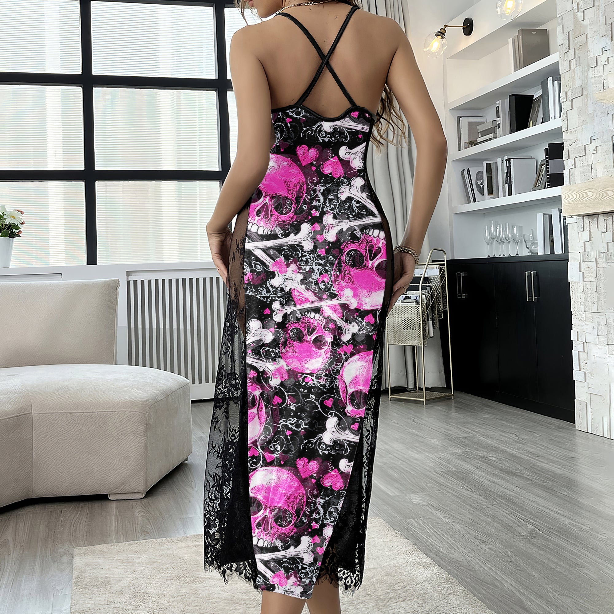 This stunning Pink Skull Graffiti lace nightgown features a unique skull rose pattern that adds a touch of edgy style to its feminine design. The cami style and cross back straps ensure a comfortable and flattering fit, while the soft lace material feels gentle against your skin. This women's nightgown is perfect for a restful night's sleep or for lounging around the house. Its understated elegance and edgy design make it a versatile addition to your sleepwear collection. Whether you're treating yourself or looking for a thoughtful gift, this Pink Skull Graffiti lace nightgown is a great choice that any woman will love.