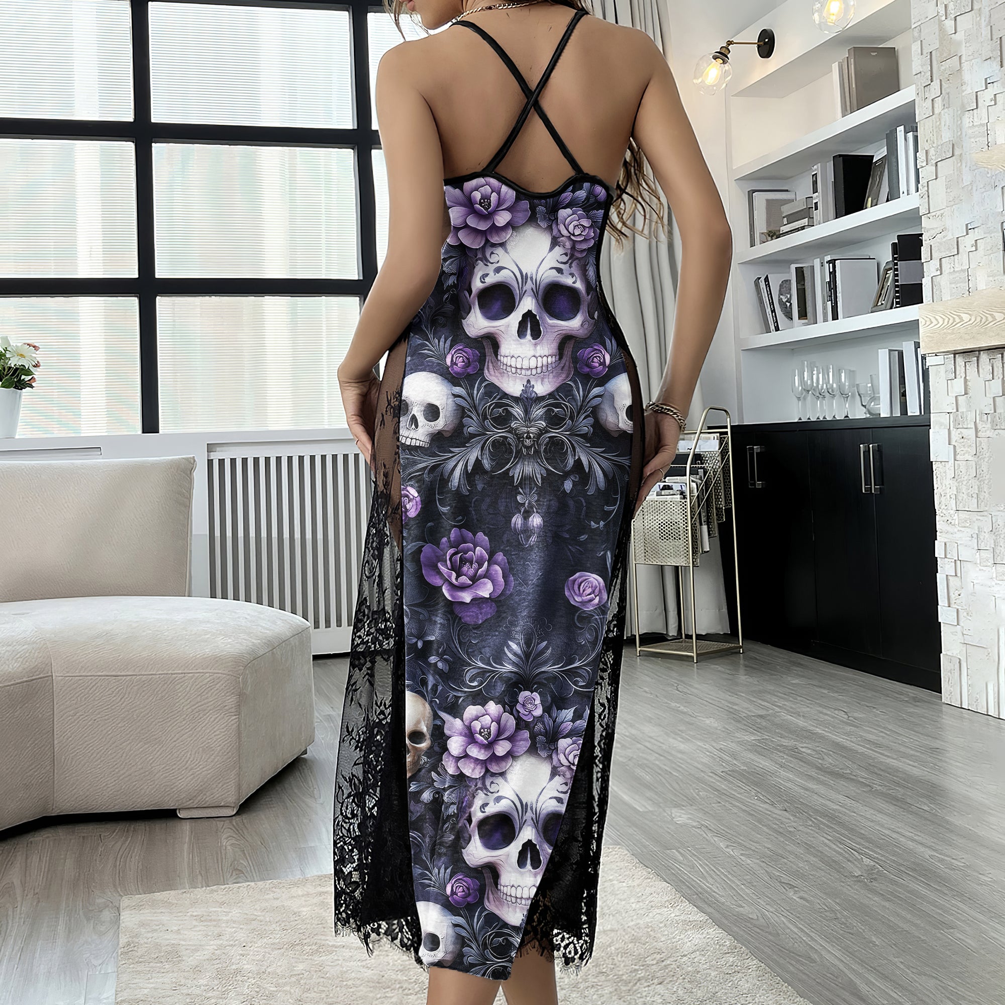 This stunning Purple Gothic Skull Art lace nightgown features a unique skull rose pattern that adds a touch of edgy style to its feminine design. The cami style and cross back straps ensure a comfortable and flattering fit, while the soft lace material feels gentle against your skin. This women's nightgown is perfect for a restful night's sleep or for lounging around the house. Its understated elegance and edgy design make it a versatile addition to your sleepwear collection. Whether you're treating yourself or looking for a thoughtful gift, this Purple Gothic Skull Art lace nightgown is a great choice that any woman will love.