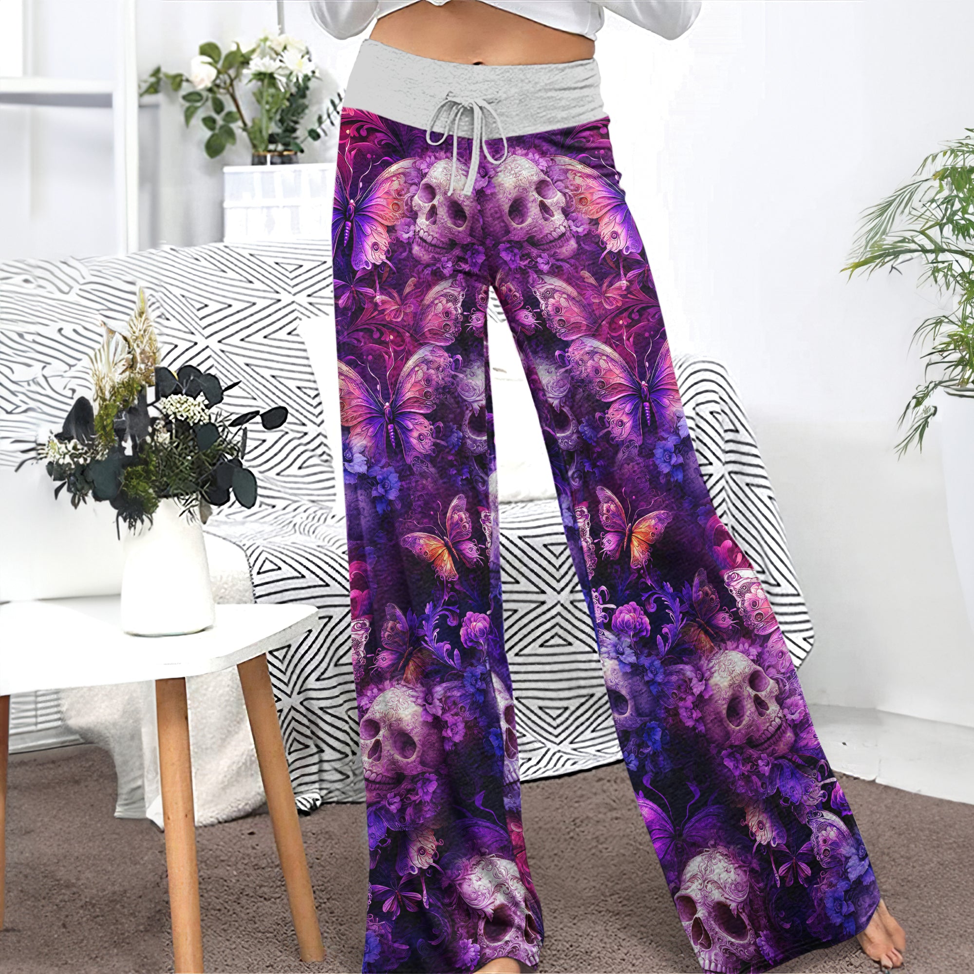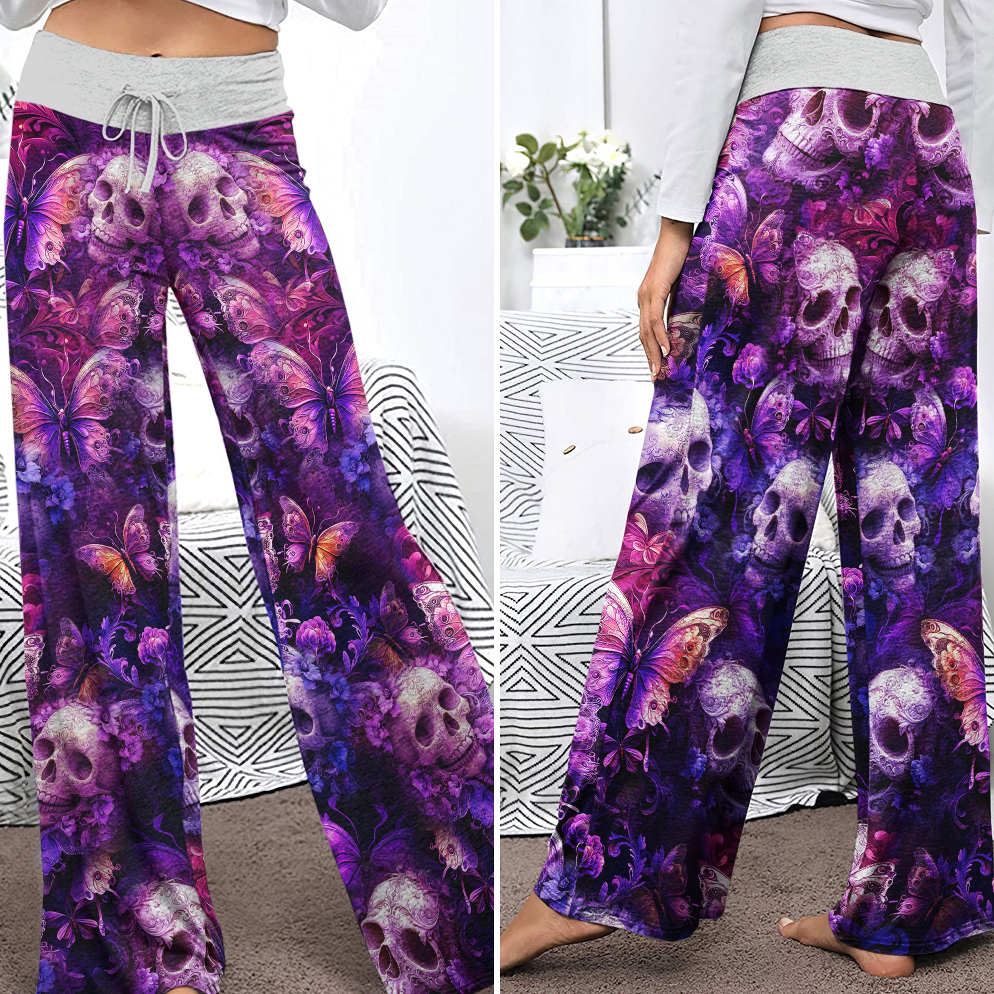 Purple Skull Butterfly Pattern Women's High-waisted Wide Leg Pants | Wonder Skull