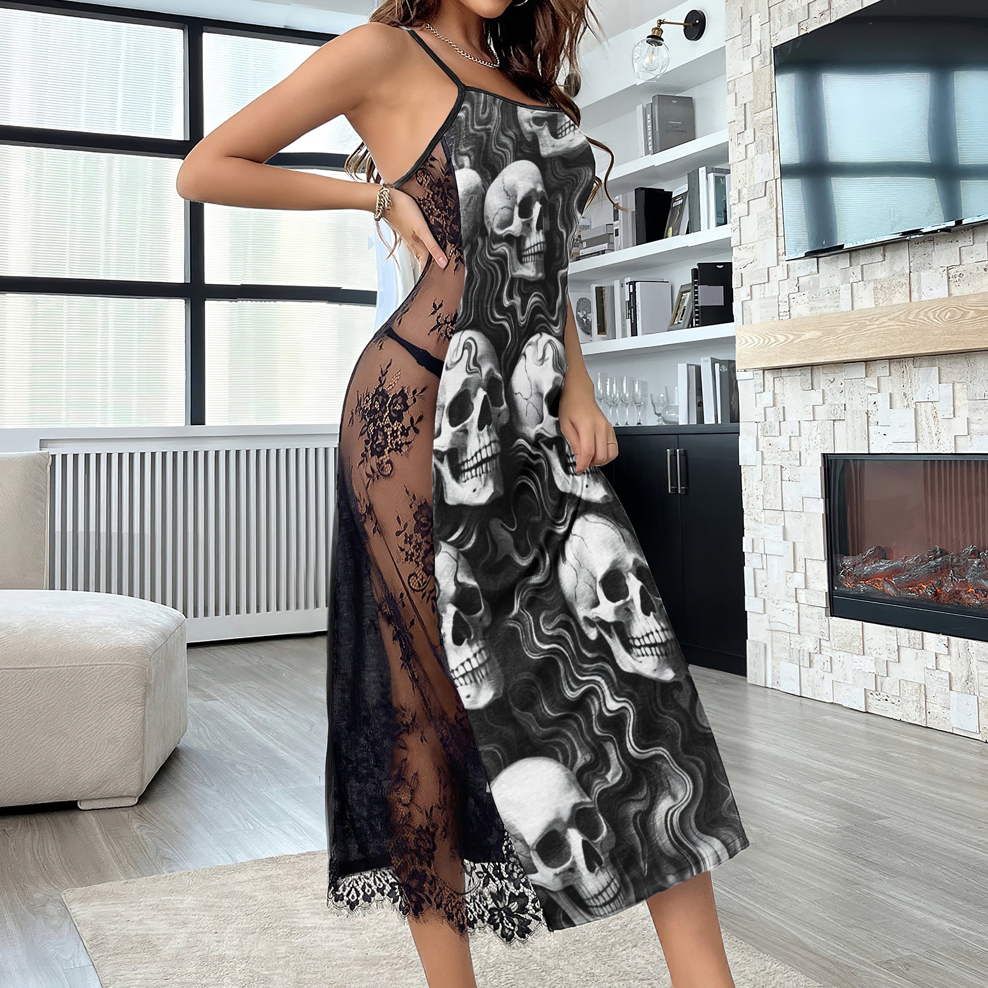 This stunning Skull Gothic Artwork lace nightgown features a unique skull rose pattern that adds a touch of edgy style to its feminine design. The cami style and cross back straps ensure a comfortable and flattering fit, while the soft lace material feels gentle against your skin. This women's nightgown is perfect for a restful night's sleep or for lounging around the house. Its understated elegance and edgy design make it a versatile addition to your sleepwear collection. Whether you're treating yourself or looking for a thoughtful gift, this Skull Gothic Artwork lace nightgown is a great choice that any woman will love.