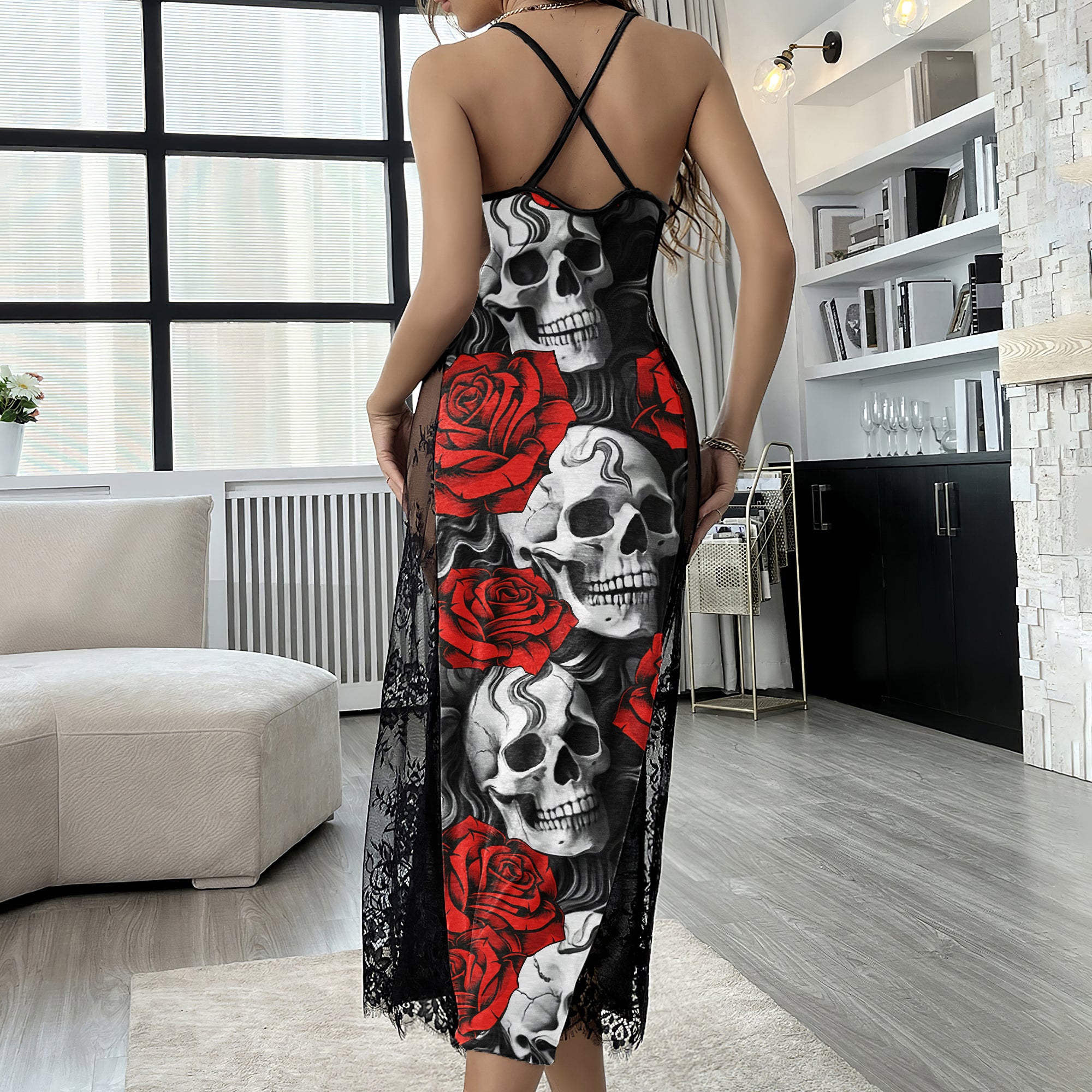 This stunning Skull Rose Gothic Art lace nightgown features a unique skull rose pattern that adds a touch of edgy style to its feminine design. The cami style and cross back straps ensure a comfortable and flattering fit, while the soft lace material feels gentle against your skin. This women's nightgown is perfect for a restful night's sleep or for lounging around the house. Its understated elegance and edgy design make it a versatile addition to your sleepwear collection. Whether you're treating yourself or looking for a thoughtful gift, this Skull Rose Gothic Art lace nightgown is a great choice that any woman will love.