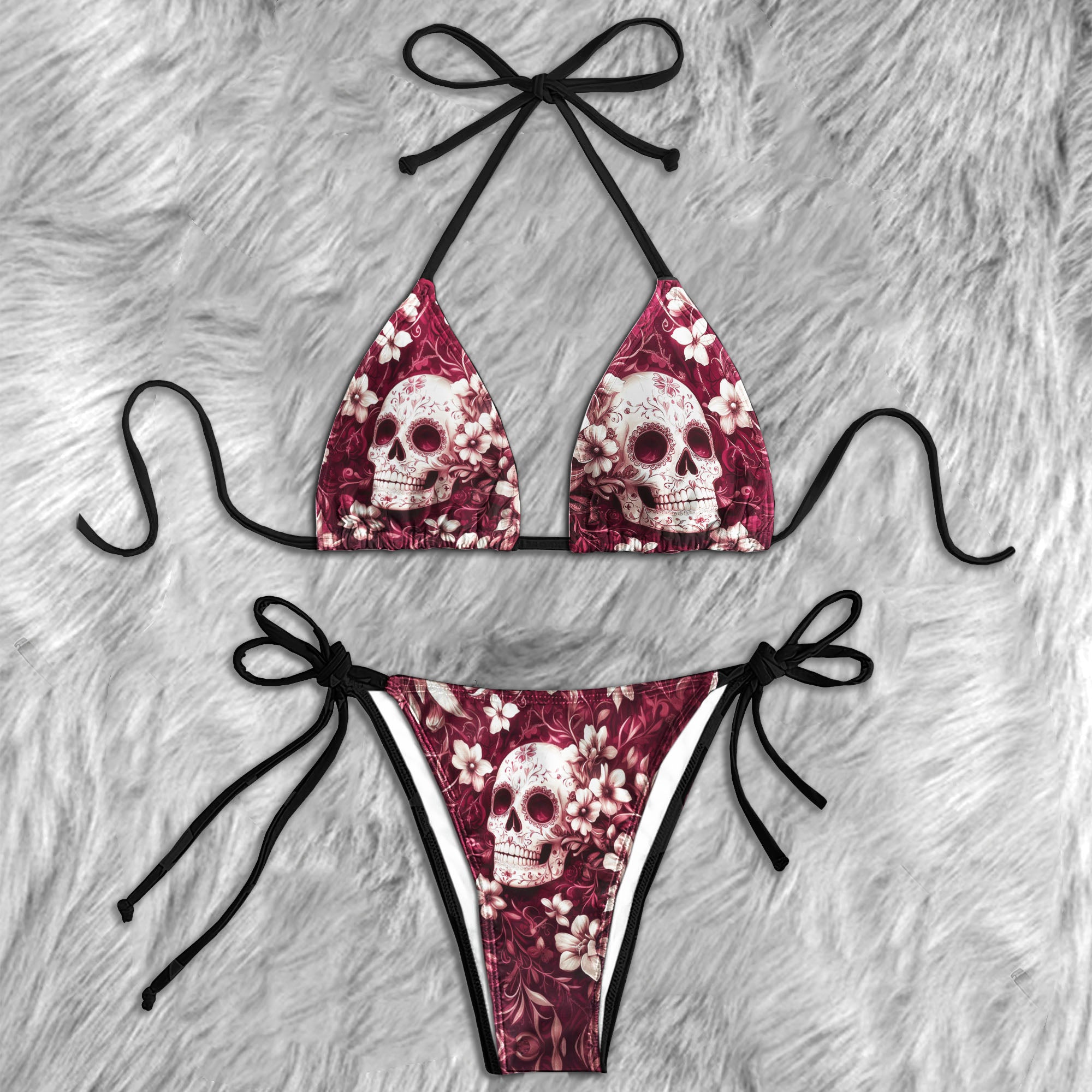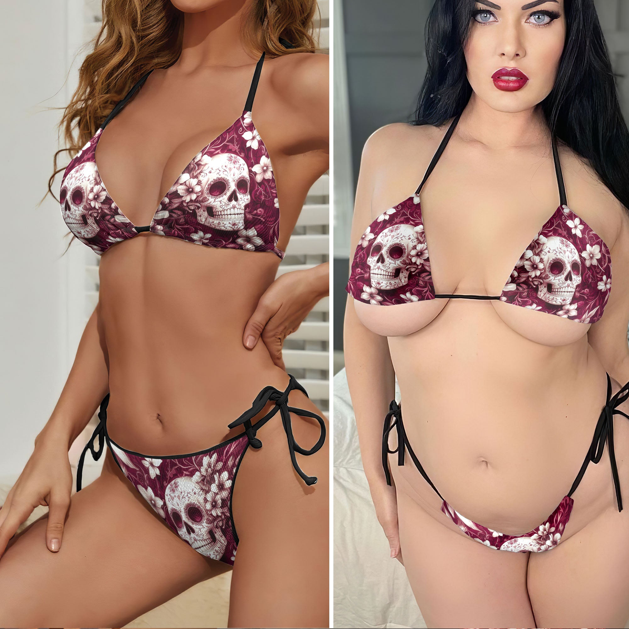 Vintage Floral Skull Pattern Micro Triangle Bikini Swimsuit