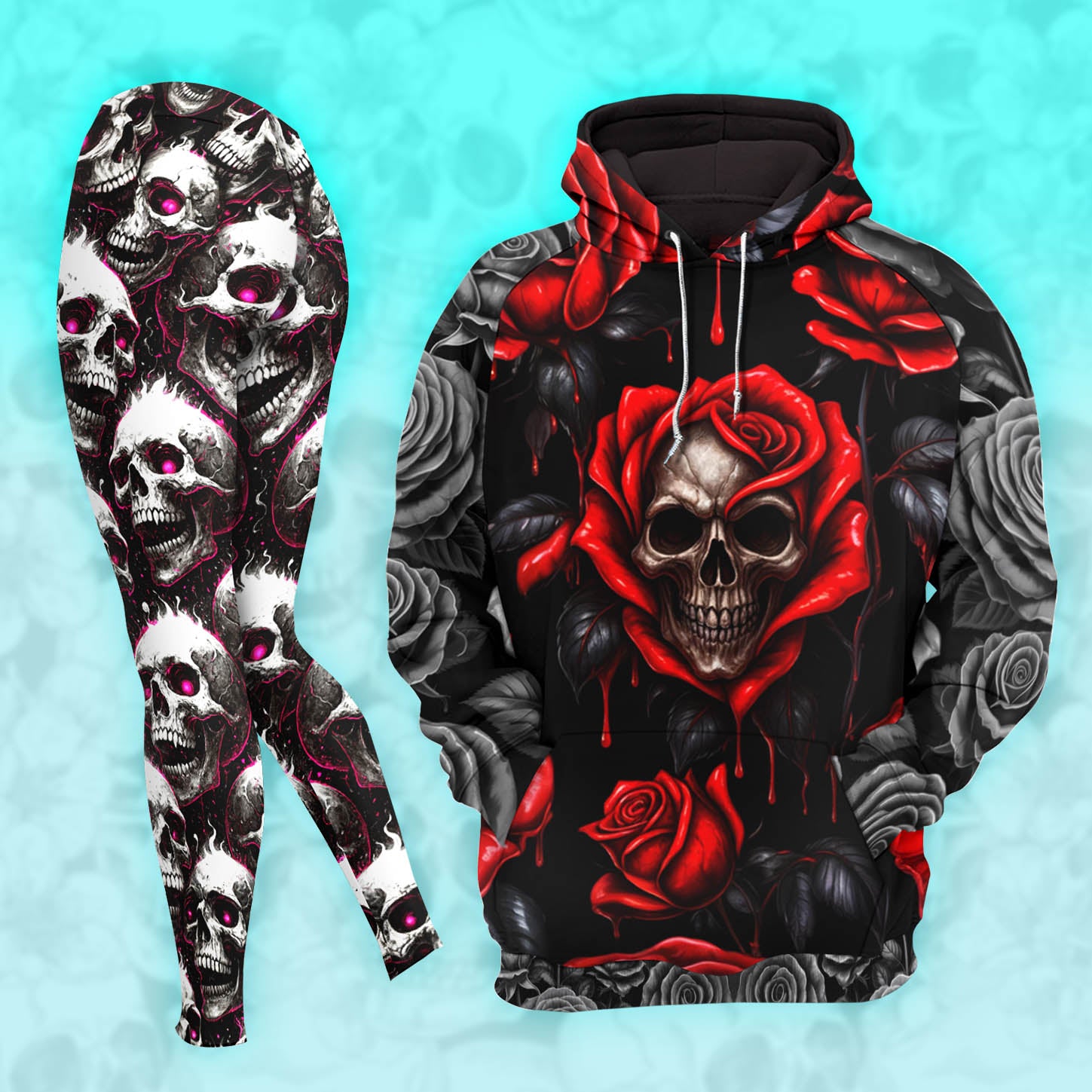 Women Hoodie and Leggings, Gothic Bleeding Rose Skull Outwear Pants Outfit