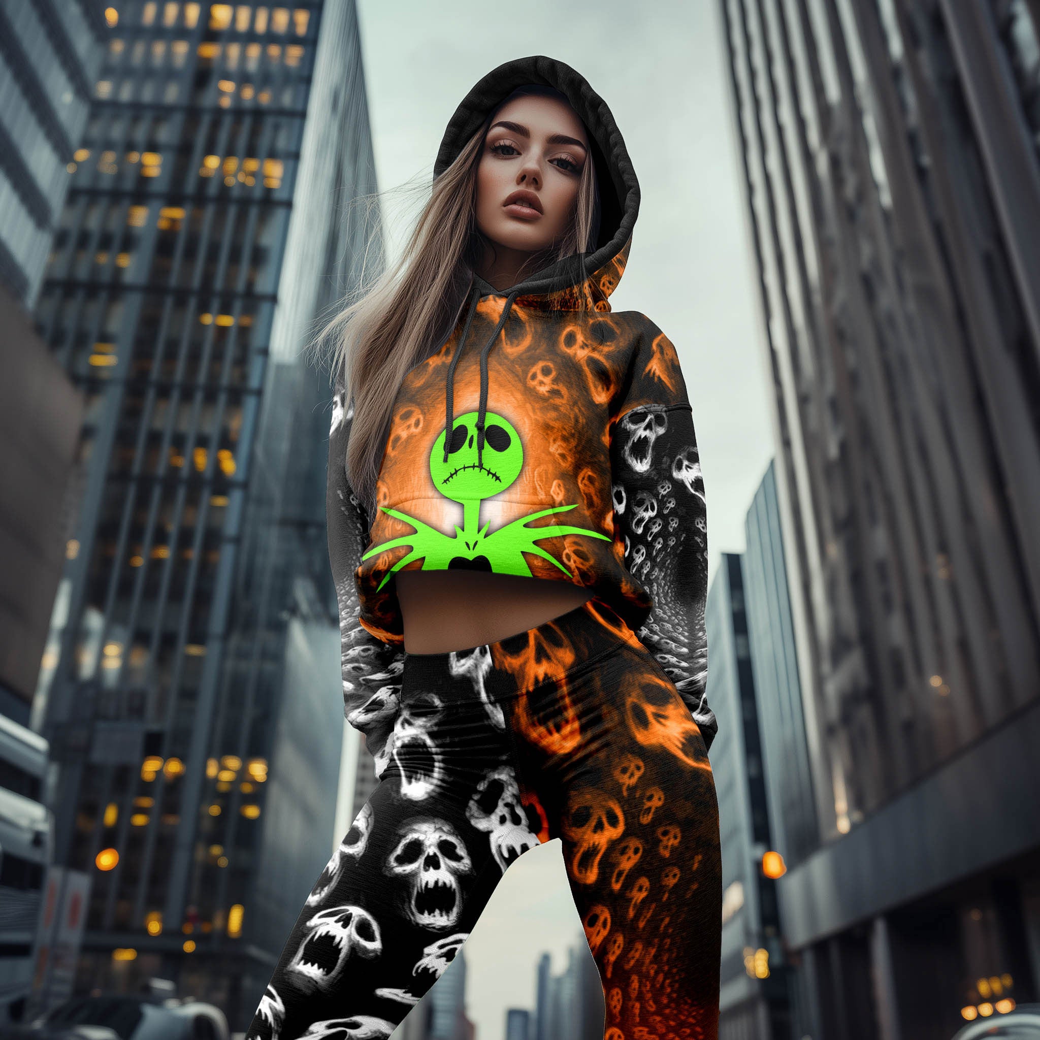 Women Hoodie and Leggings, Orange Haunted Skeleton Outwear Pants Outfit