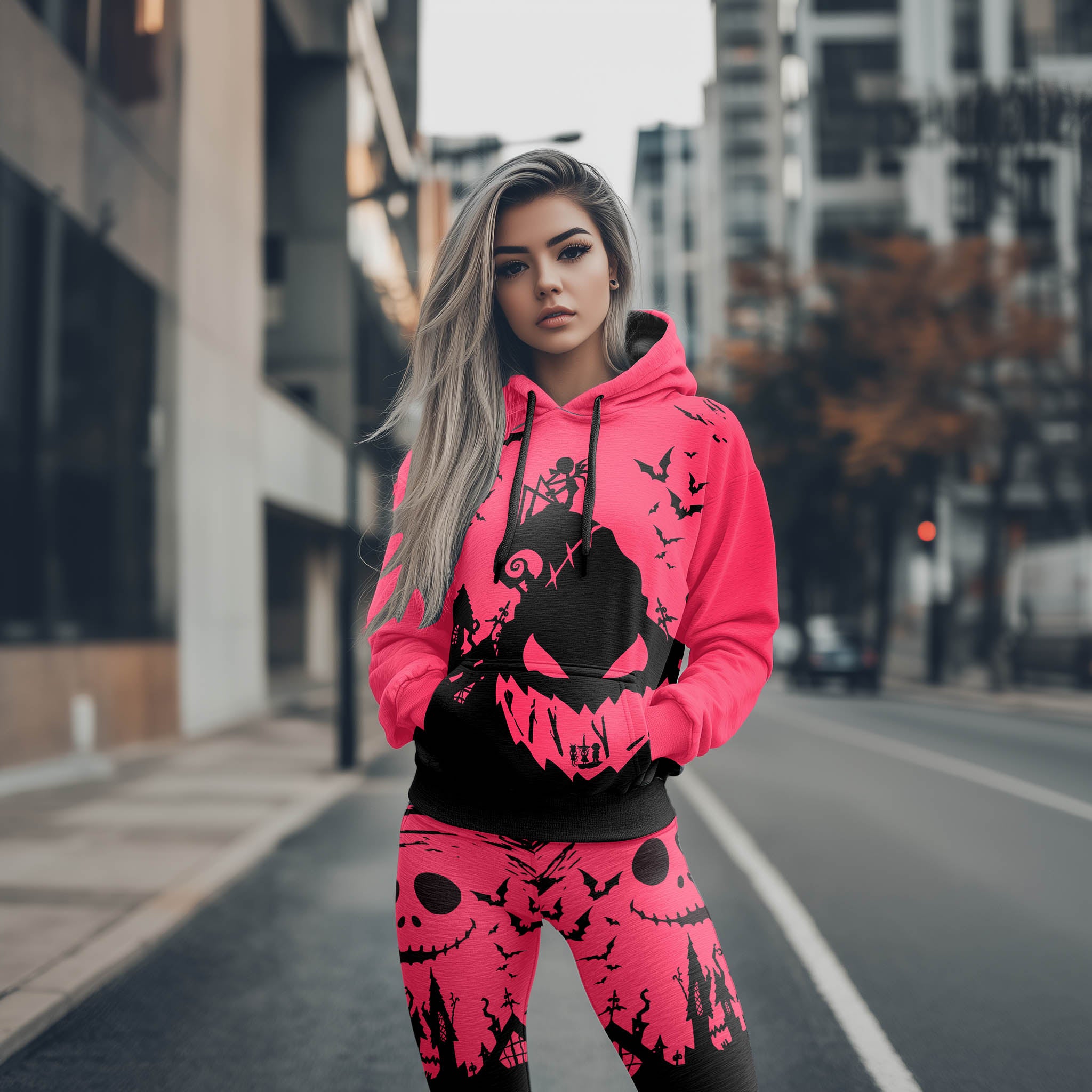 Pink Cartoon Art Combo Hoodie and Leggings - Dark and edgy matching set with skull designs for a unique and stylish look