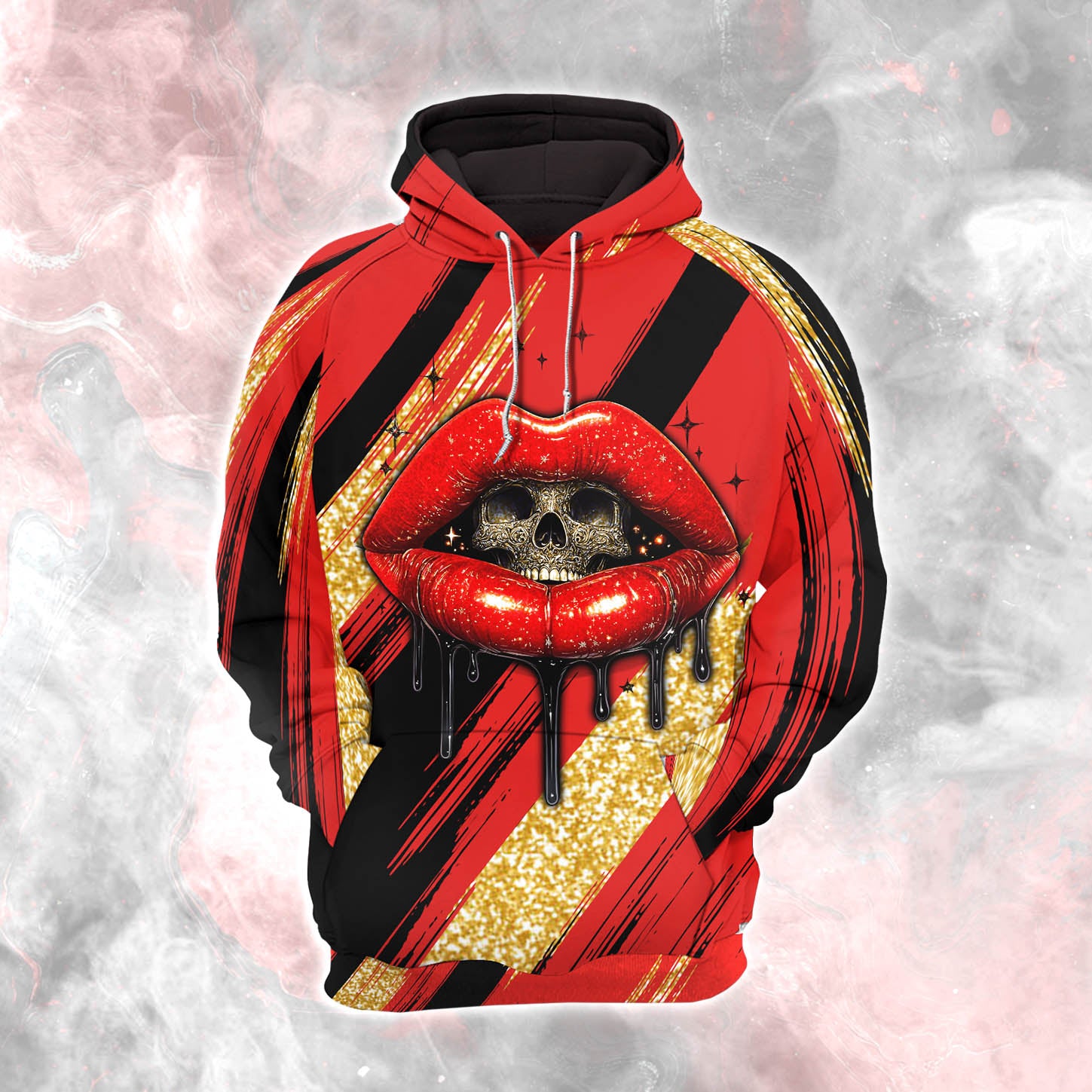 Red Glitter Skull Lip Combo Hoodie and Leggings - Dark and edgy matching set with skull designs for a unique and stylish look