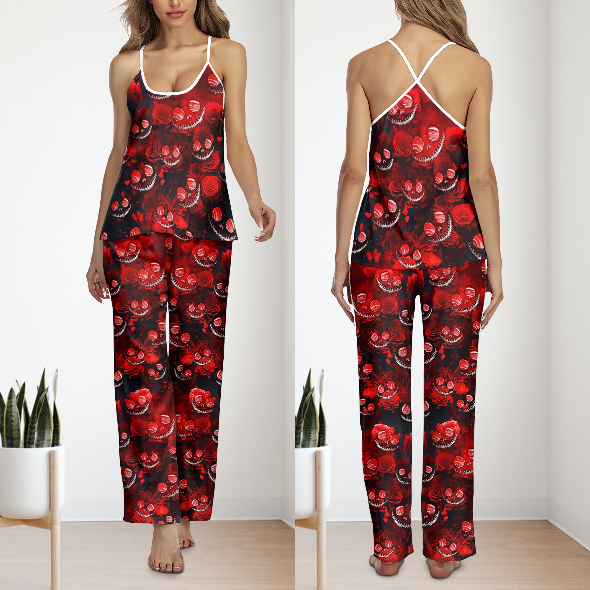 • Unleash Your Inner Rock Star: Whether you're lounging or getting ready to catch some Z’s, the Red Face Pattern Cami Pajama Set will have you feeling like you’ve just stepped out of a gothic dream. Who said comfort and edgy style can't go hand-in-hand?