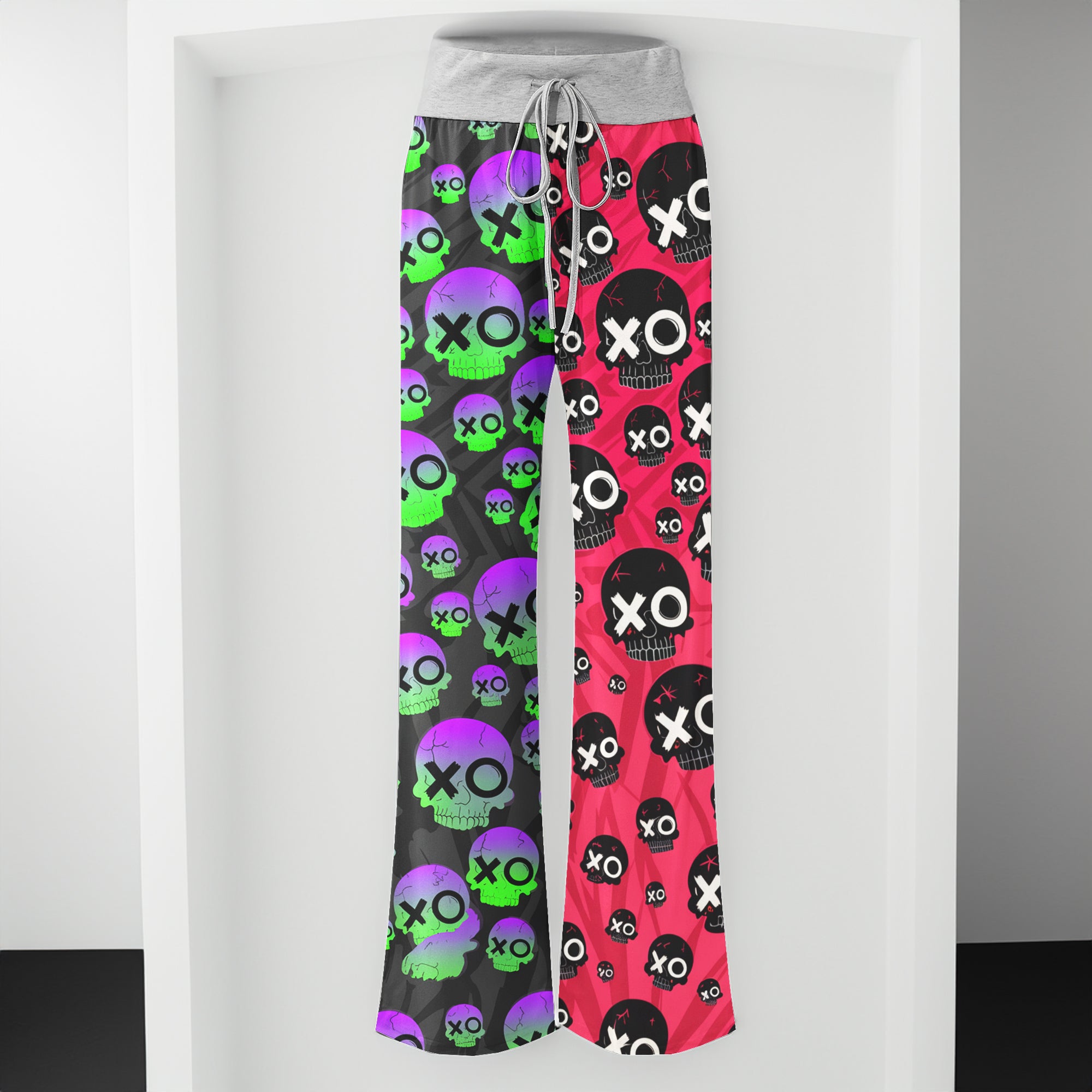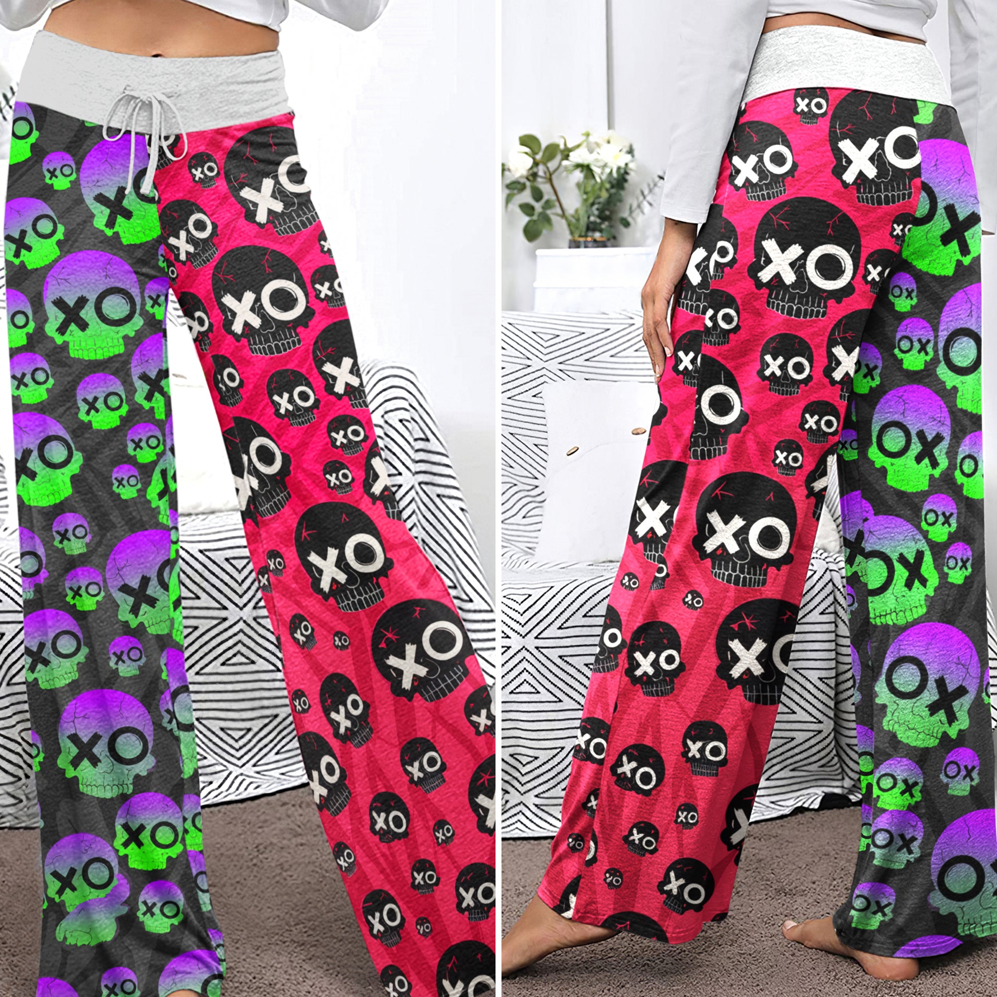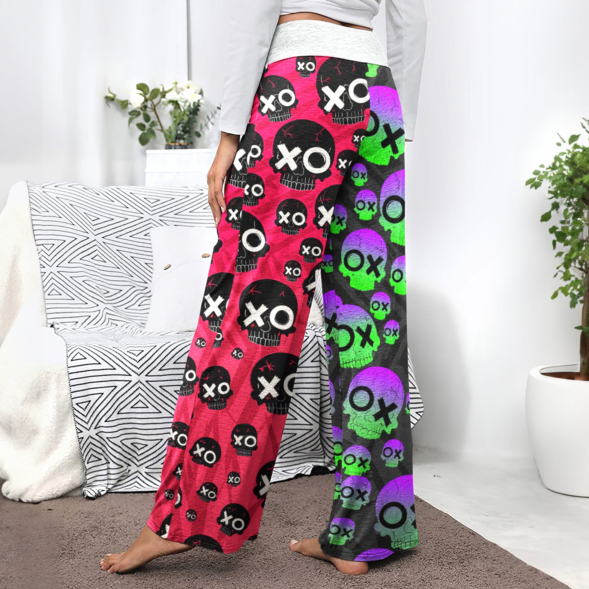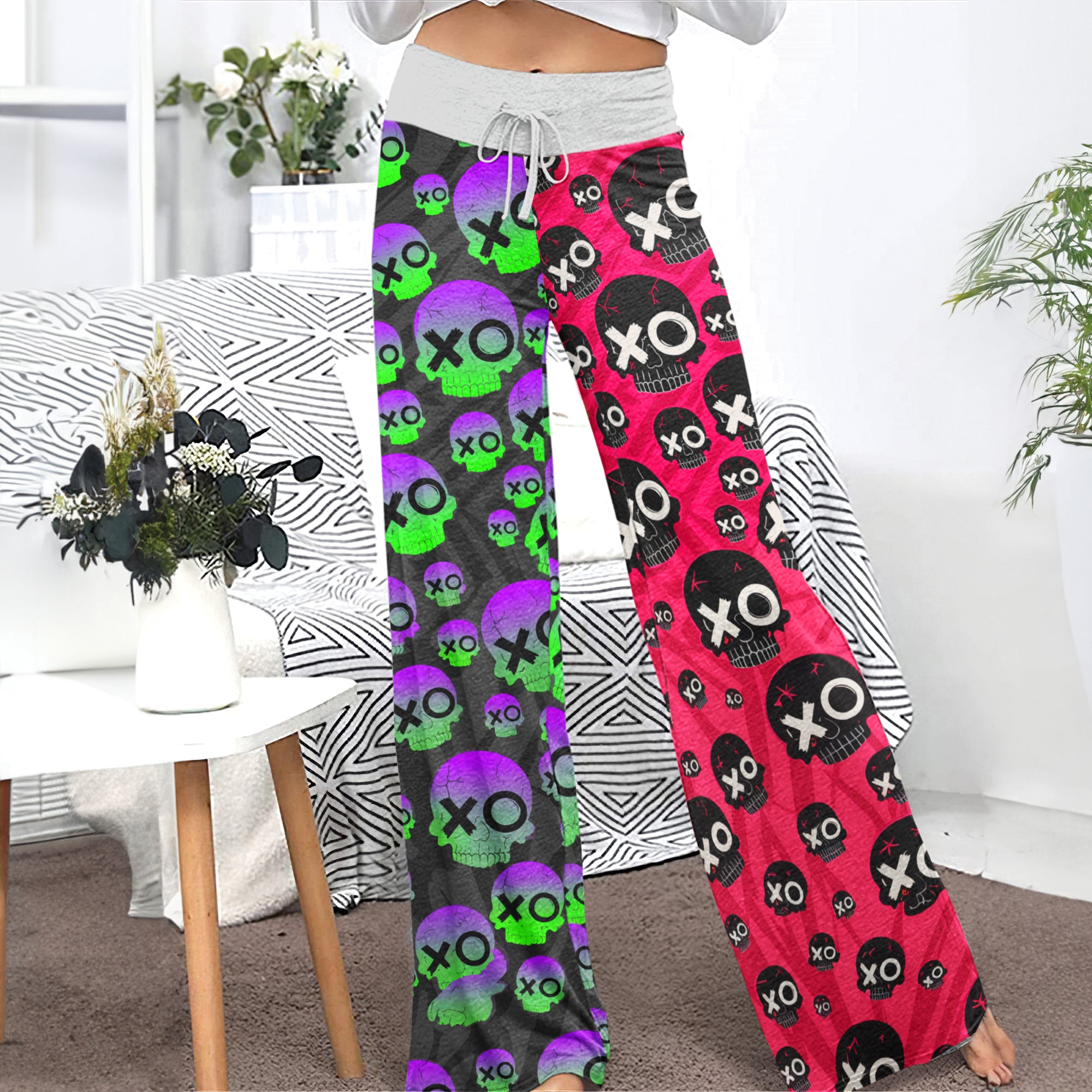 Enjoy the comfort and quality of the Comic Electric Skull Pattern High-waisted Wide Leg Pants. Constructed from a premium lightweight fabric, it offers unlimited movement, along with a unique and stylish pattern. It features a wide waistband for a streamlined and flattering fit. Perfect for any occasion, these trousers provide the perfect blend of classic style and modern design.