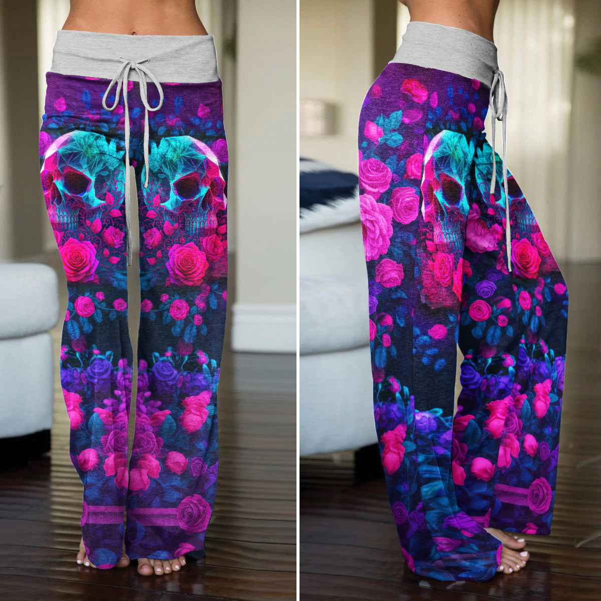 Enjoy the comfort and quality of the Neon Galaxy Skull Rose High-waisted Wide Leg Pants. Constructed from a premium lightweight fabric, it offers unlimited movement, along with a unique and stylish pattern. It features a wide waistband for a streamlined and flattering fit. Perfect for any occasion, these trousers provide the perfect blend of classic style and modern design.