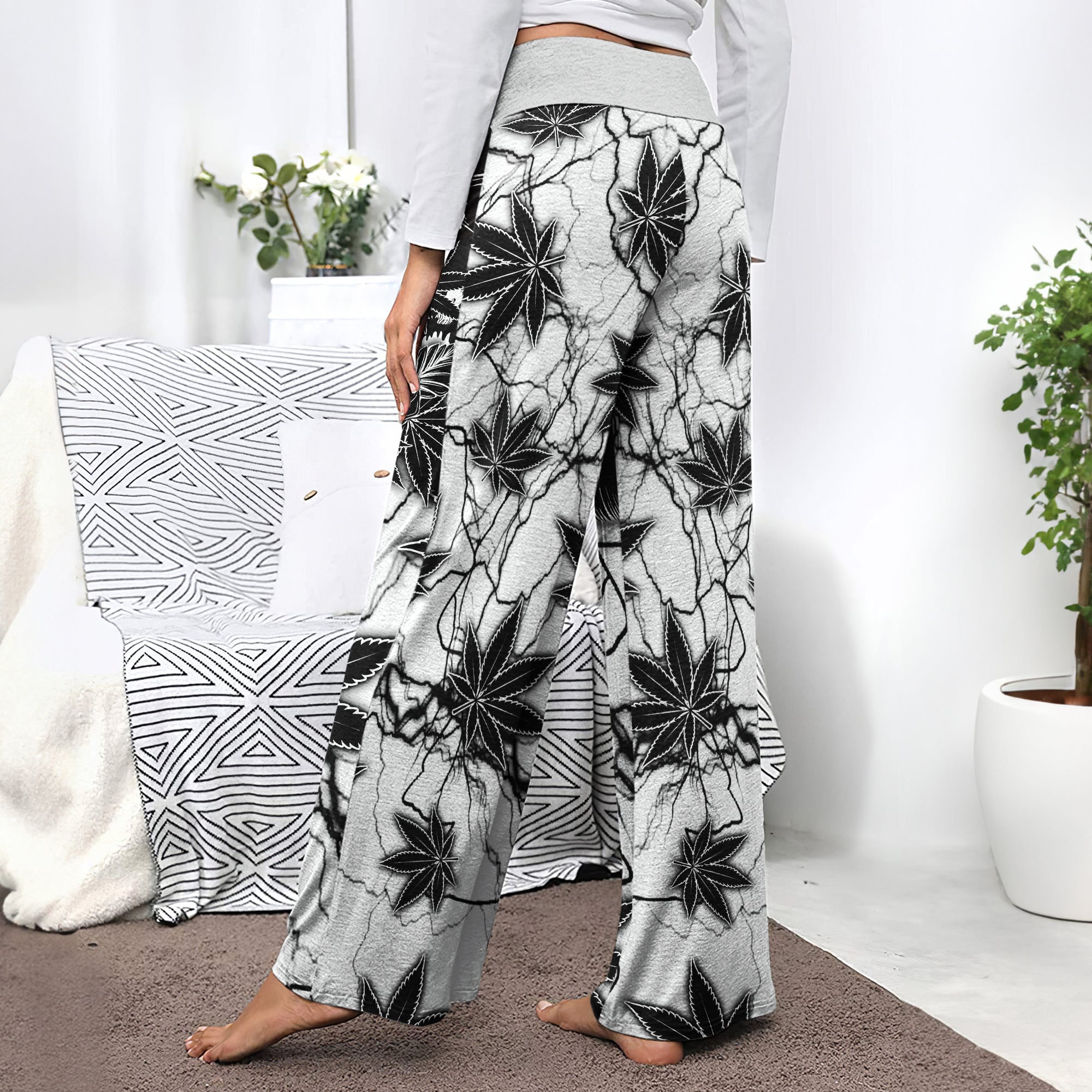 Enjoy the comfort and quality of the Black Couple Leaf Skeleton High-waisted Wide Leg Pants. Constructed from a premium lightweight fabric, it offers unlimited movement, along with a unique and stylish pattern. It features a wide waistband for a streamlined and flattering fit. Perfect for any occasion, these trousers provide the perfect blend of classic style and modern design.