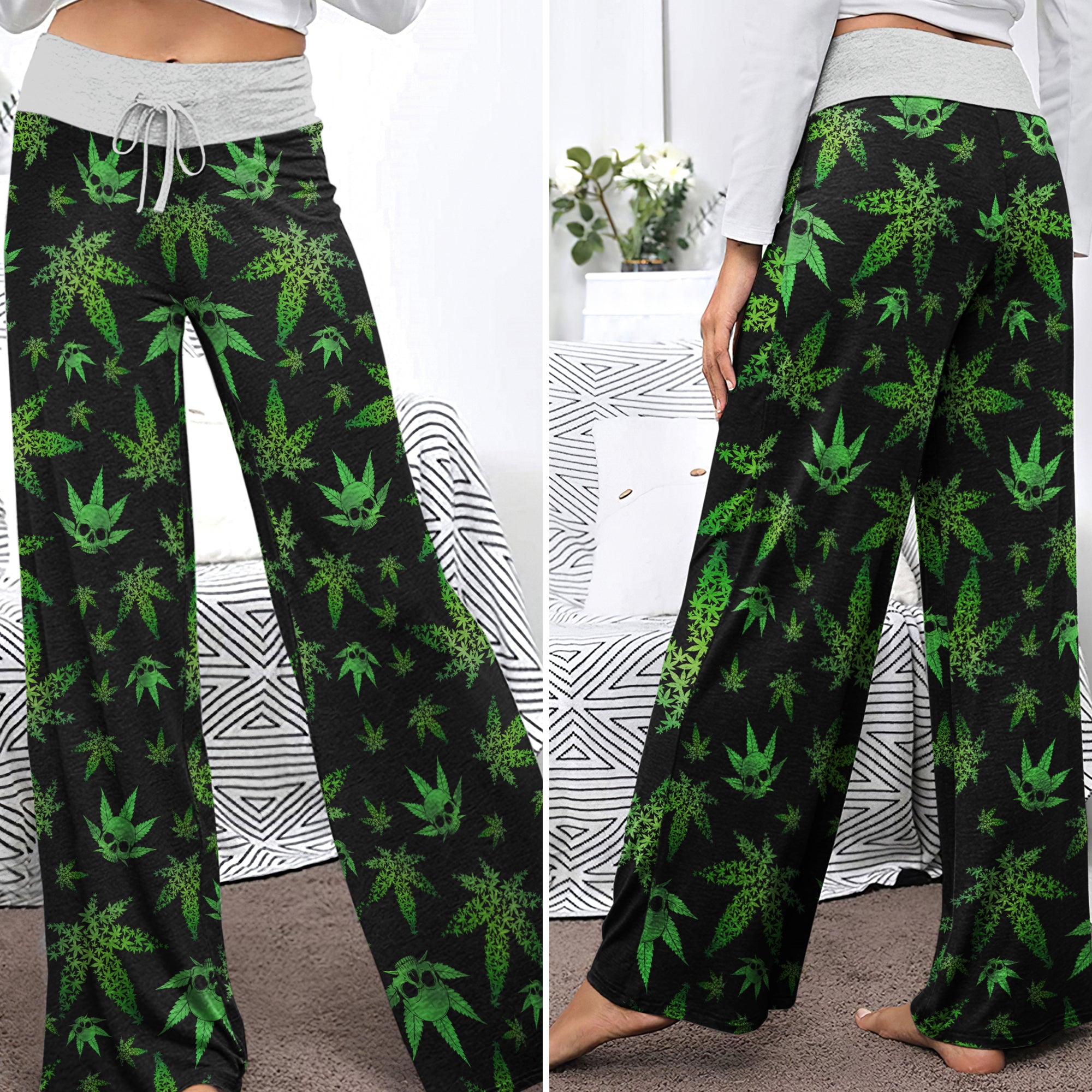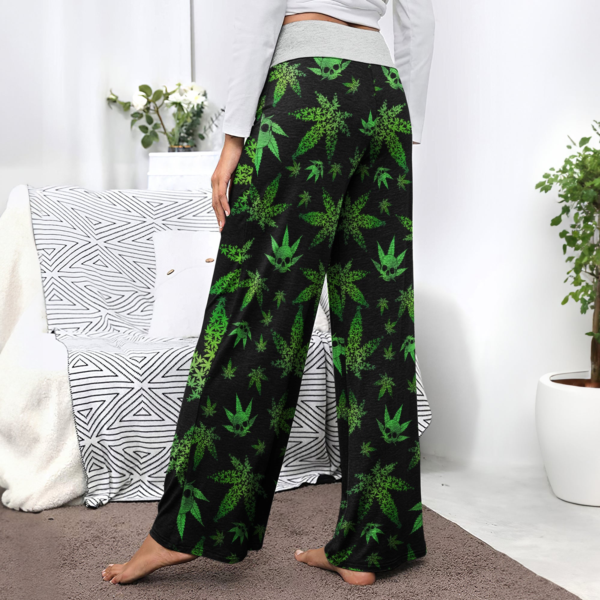Green Skull Leaf Pattern Women's High-waisted Wide Leg Pants