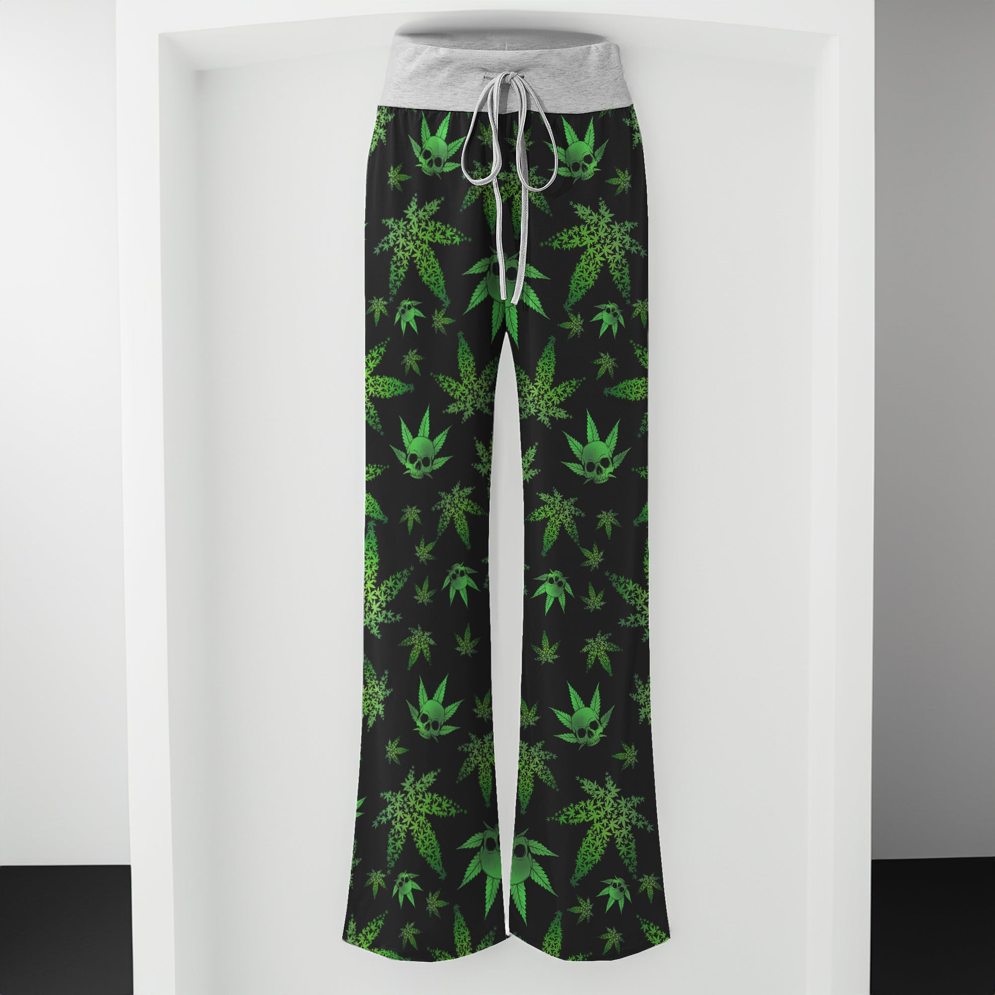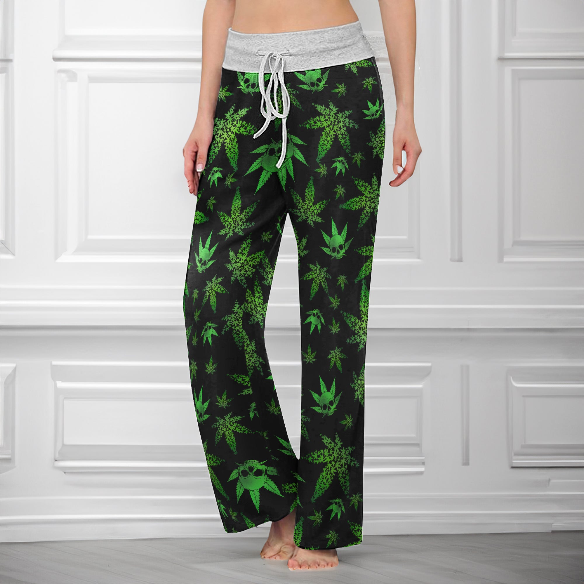 Green Skull Leaf Pattern Women's High-waisted Wide Leg Pants | Wonder Skull