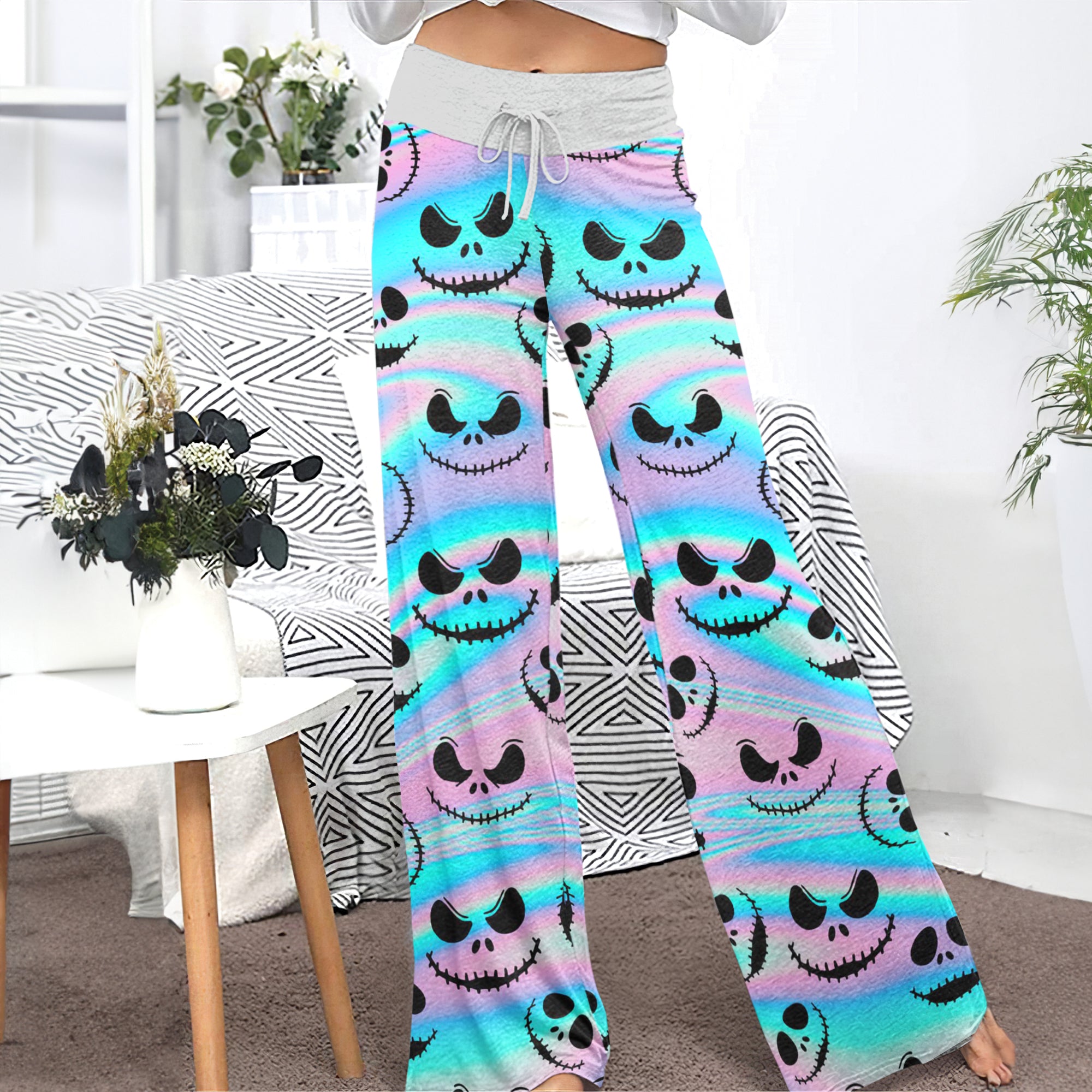 Holographic Pattern Women's High-waisted Wide Leg Pants | Wonder Skull