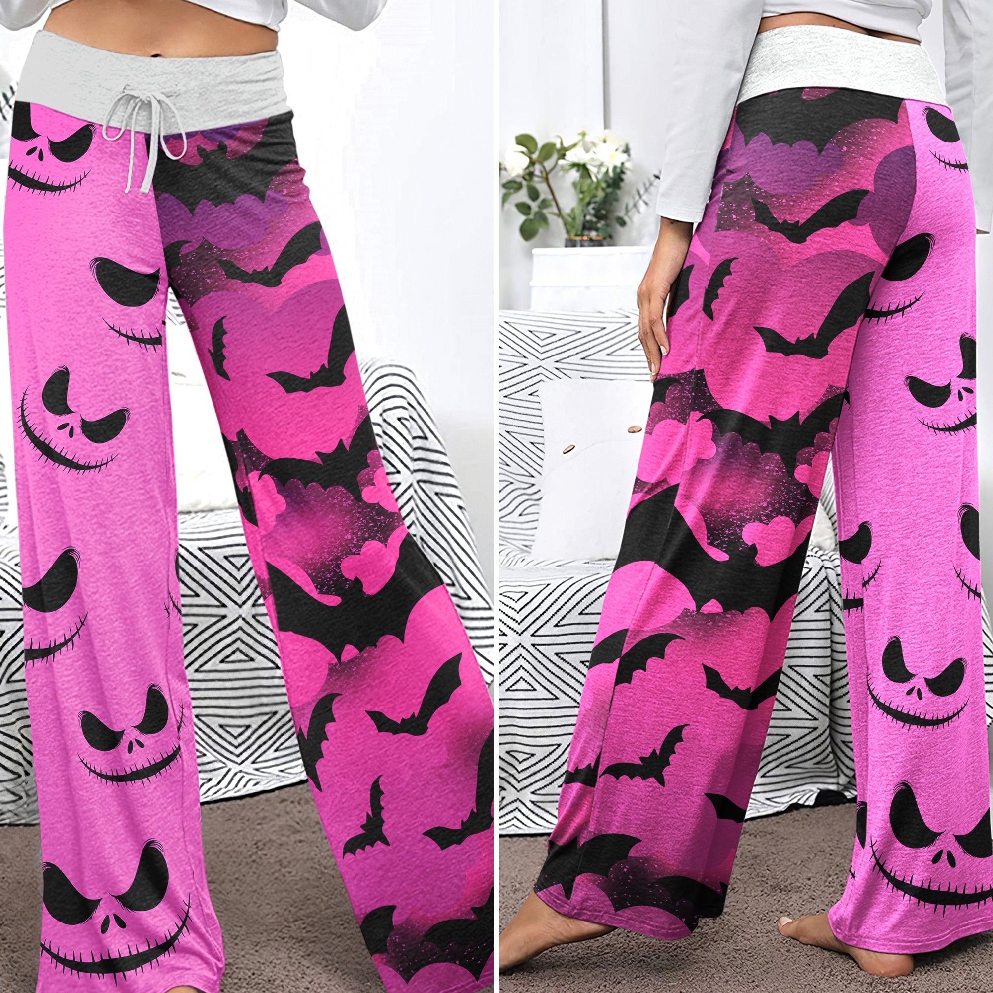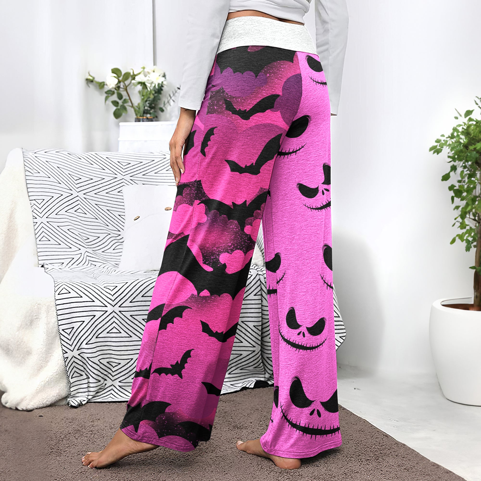 Pink Bat Skull Pattern Women's High-waisted Wide Leg Pants
