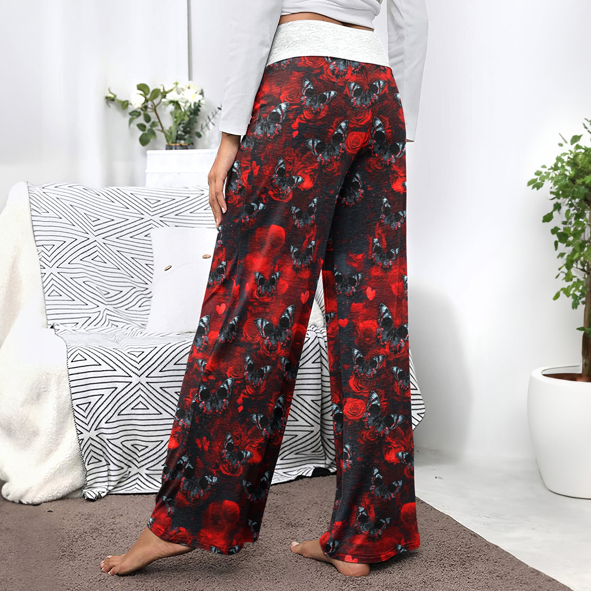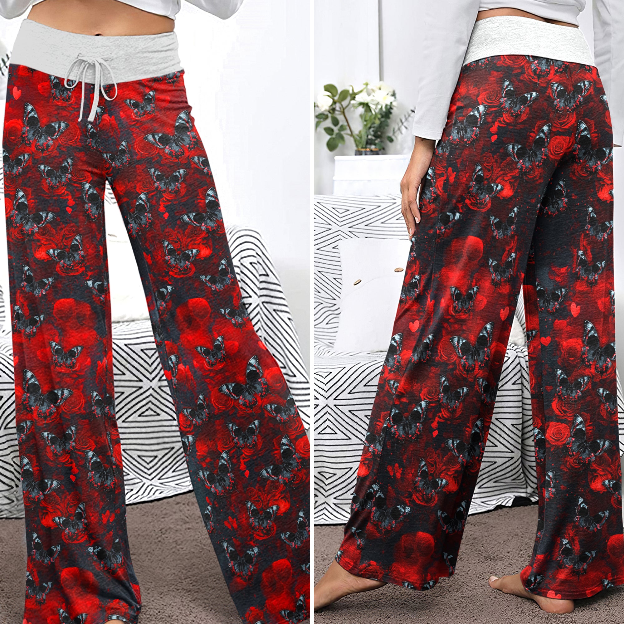 Red Butterfly Skull Pattern Women's High-waisted Wide Leg Pants