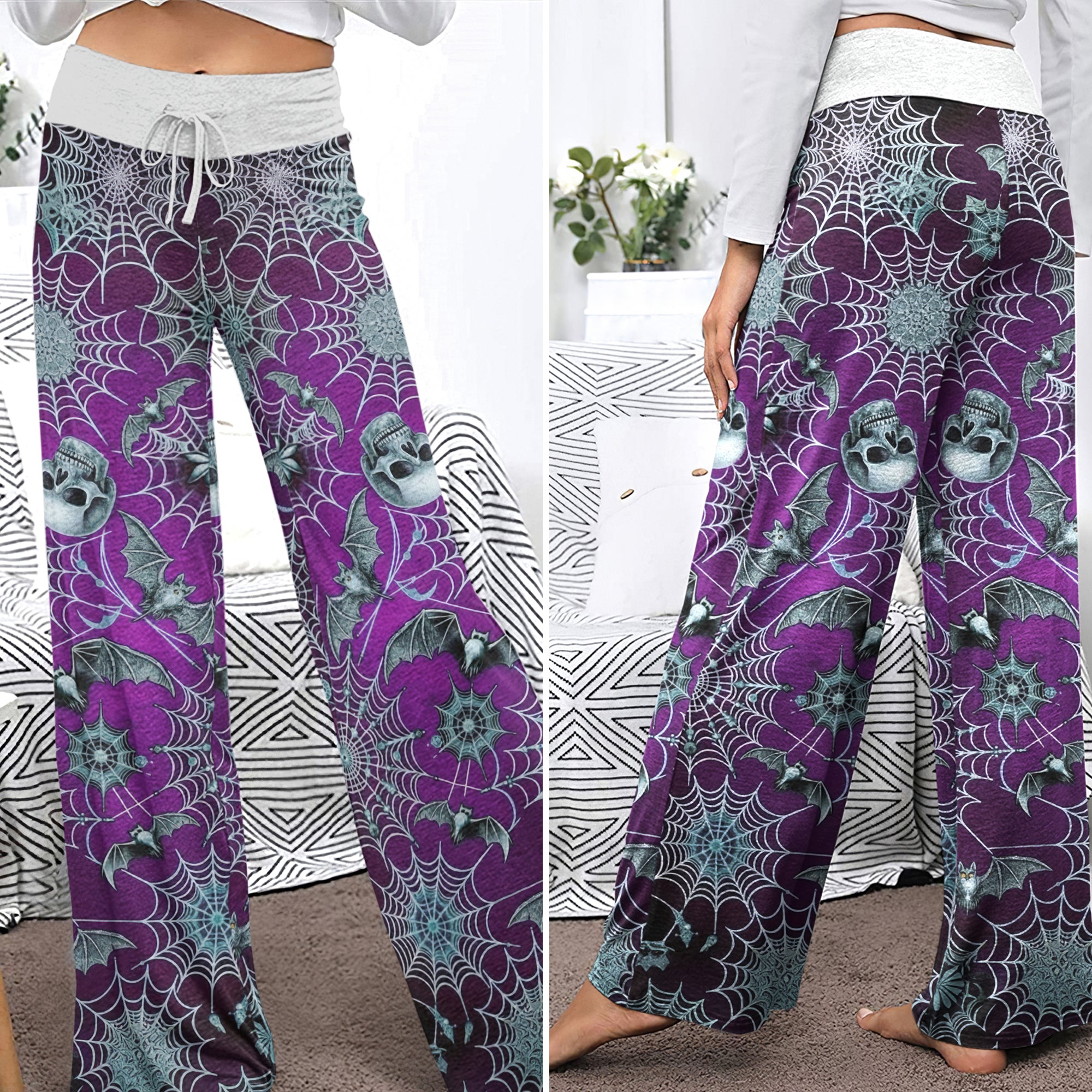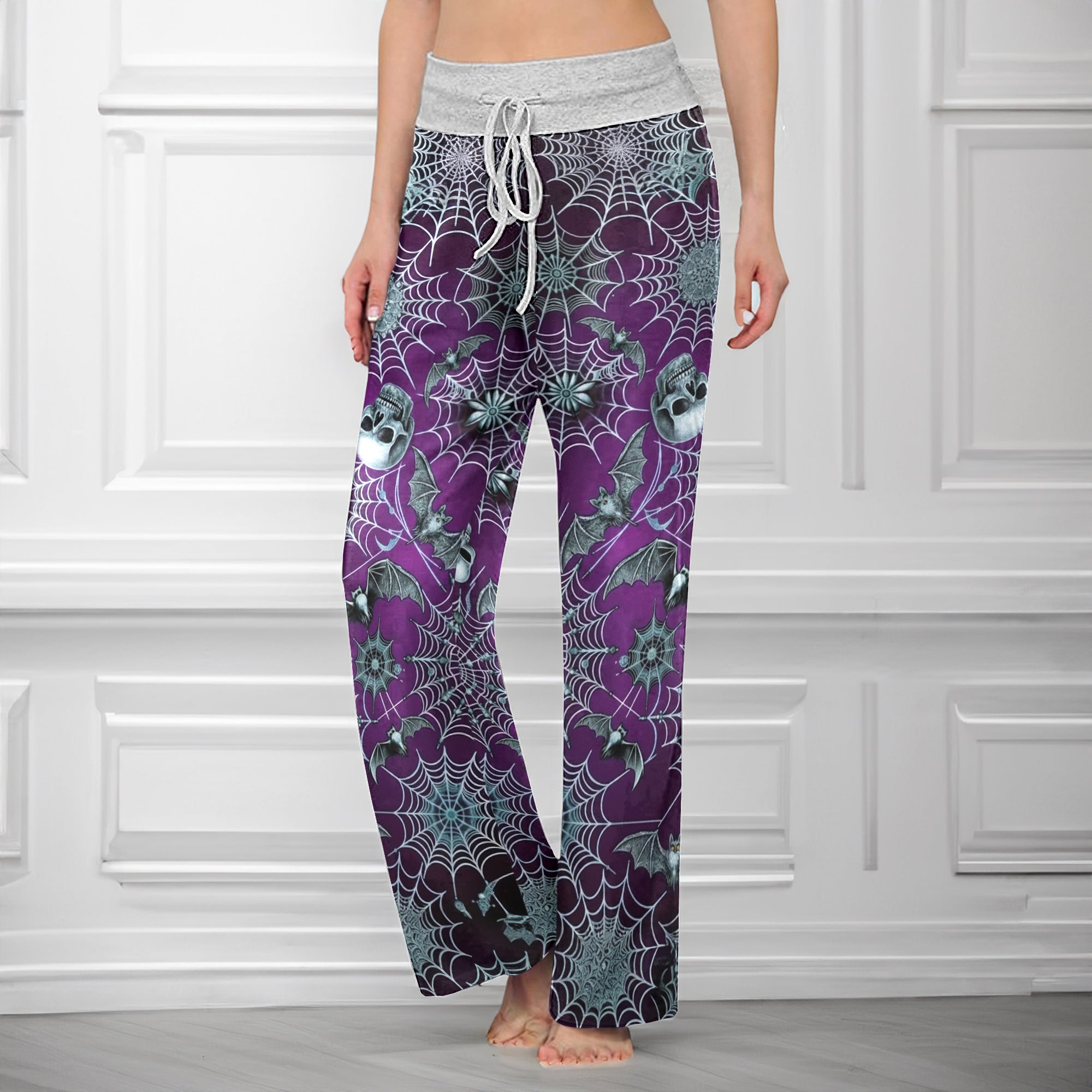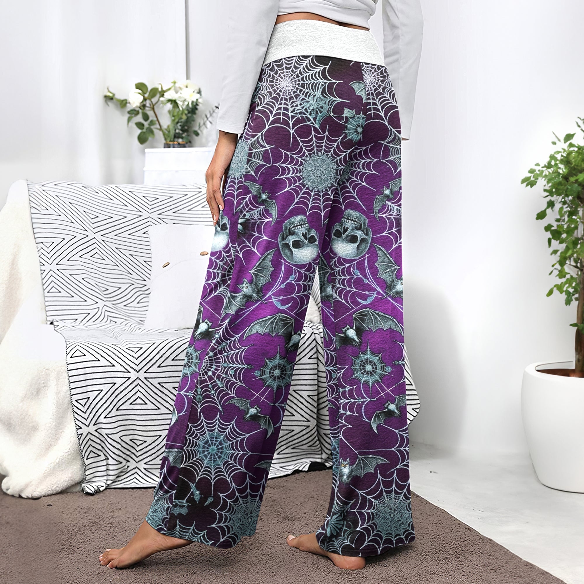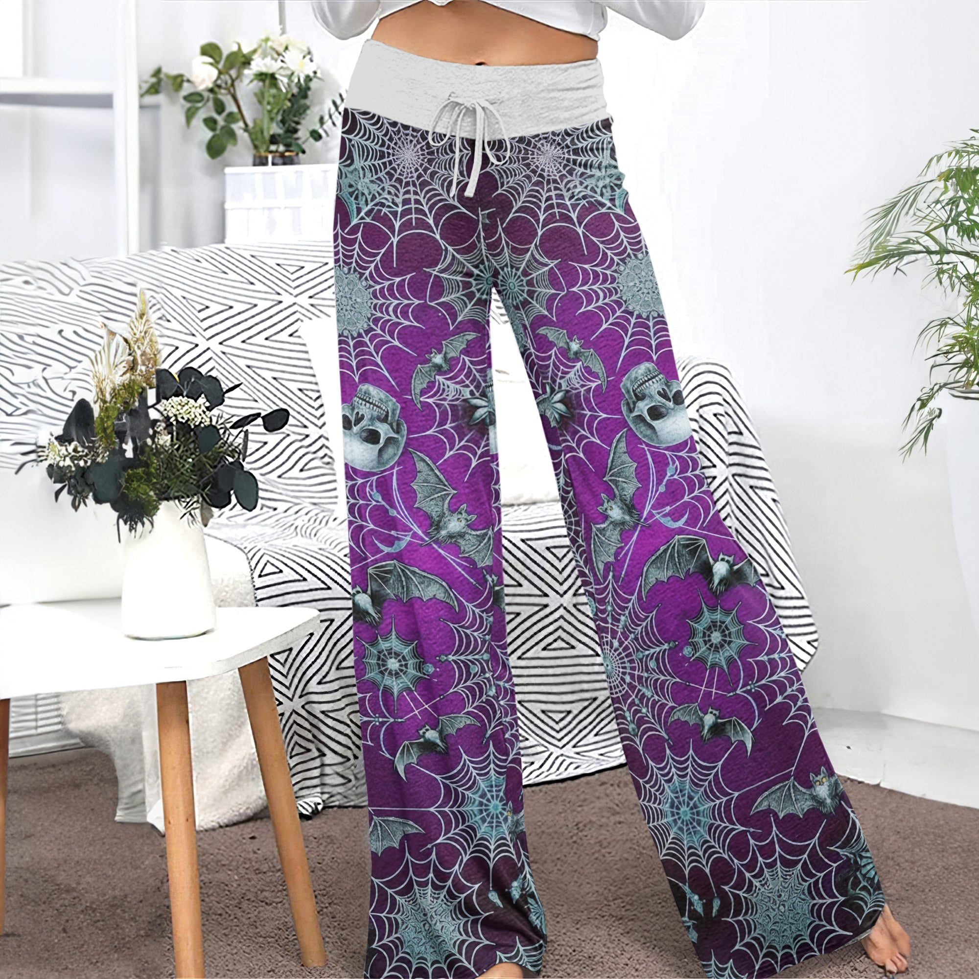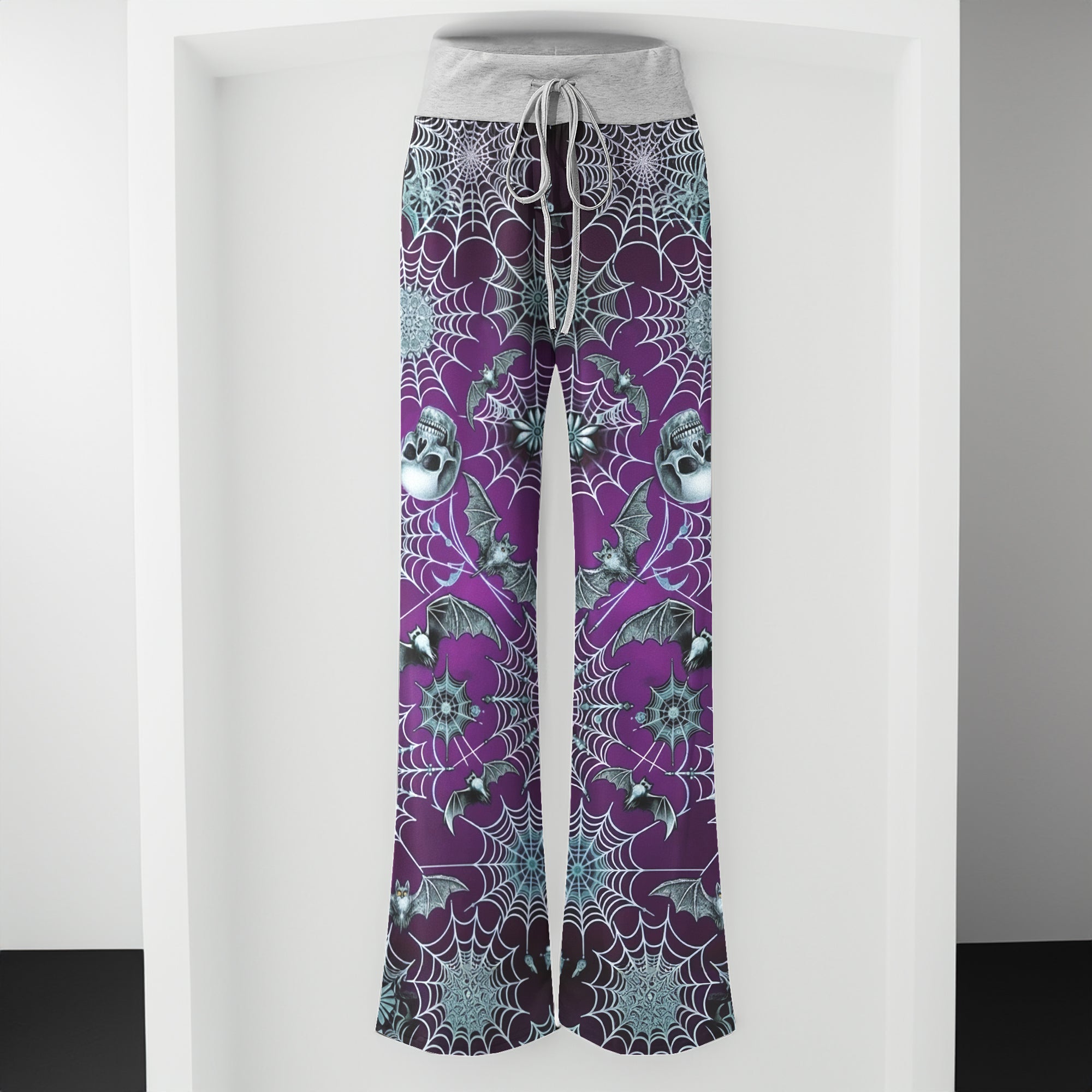 Enjoy the comfort and quality of the Purple Mist Skull Realm High-waisted Wide Leg Pants. Constructed from a premium lightweight fabric, it offers unlimited movement, along with a unique and stylish pattern. It features a wide waistband for a streamlined and flattering fit. Perfect for any occasion, these trousers provide the perfect blend of classic style and modern design.