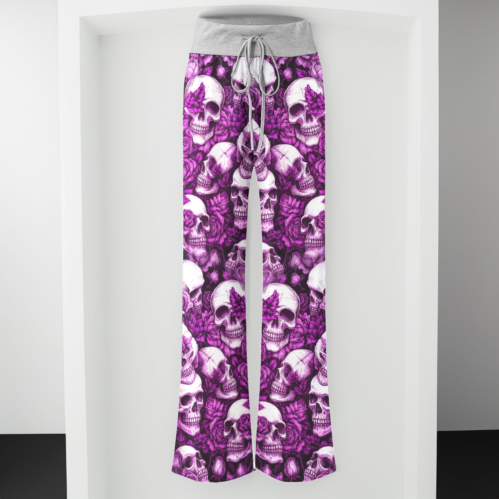 Purple Skull Rose Pattern Women's High-waisted Wide Leg Pants