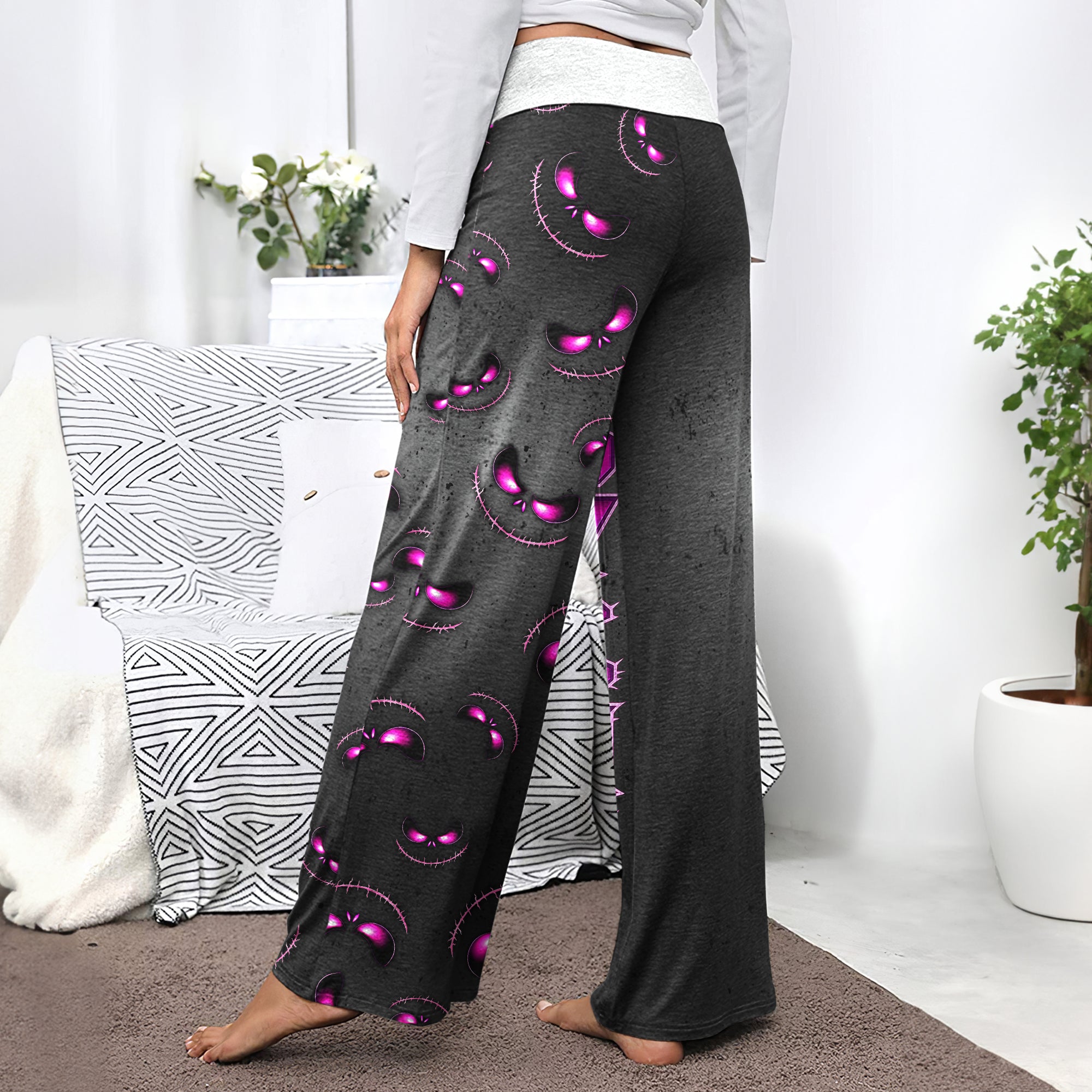 Stitched Violet Skull Pattern Women's High-waisted Wide Leg Pants