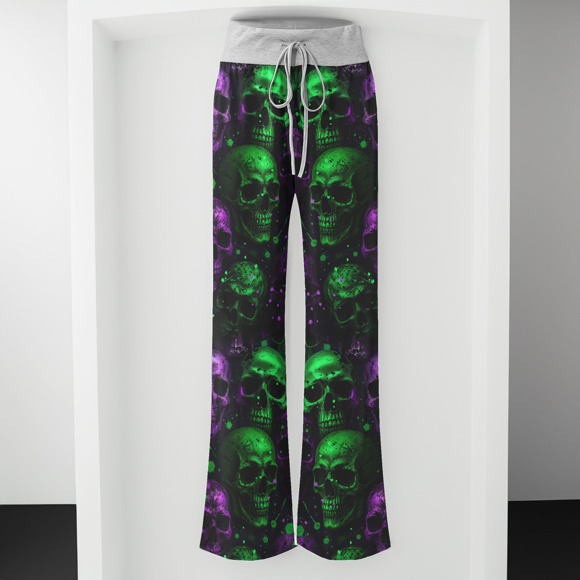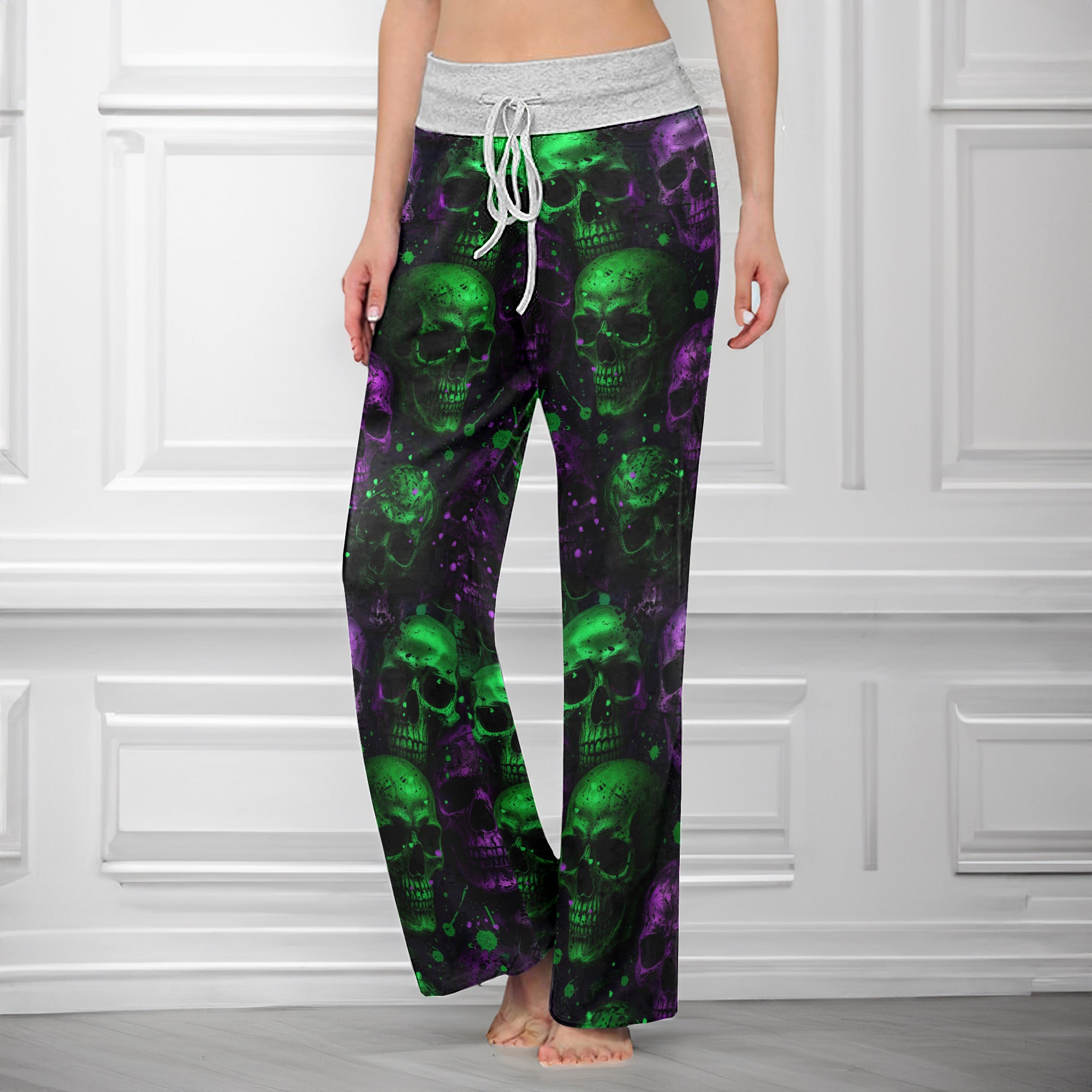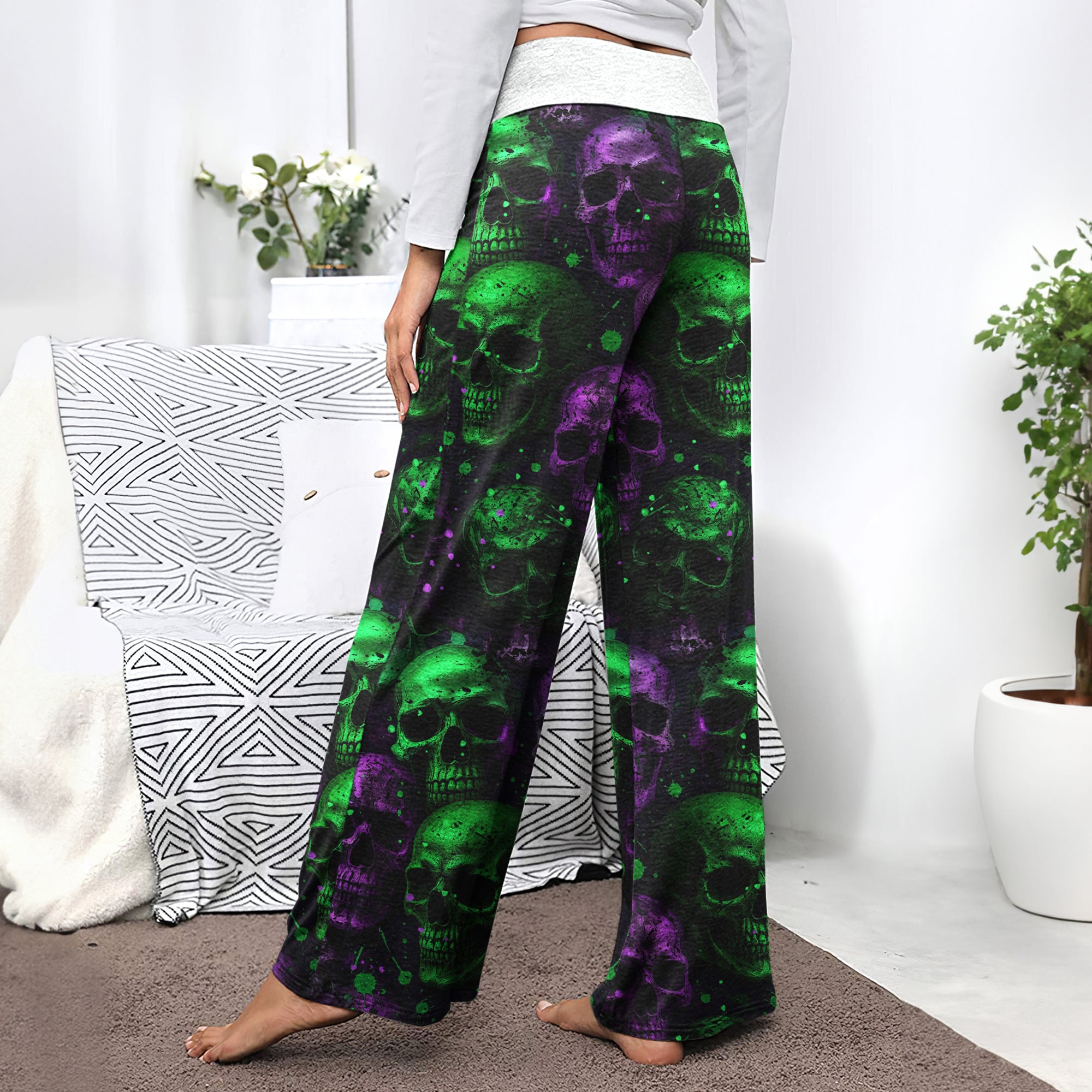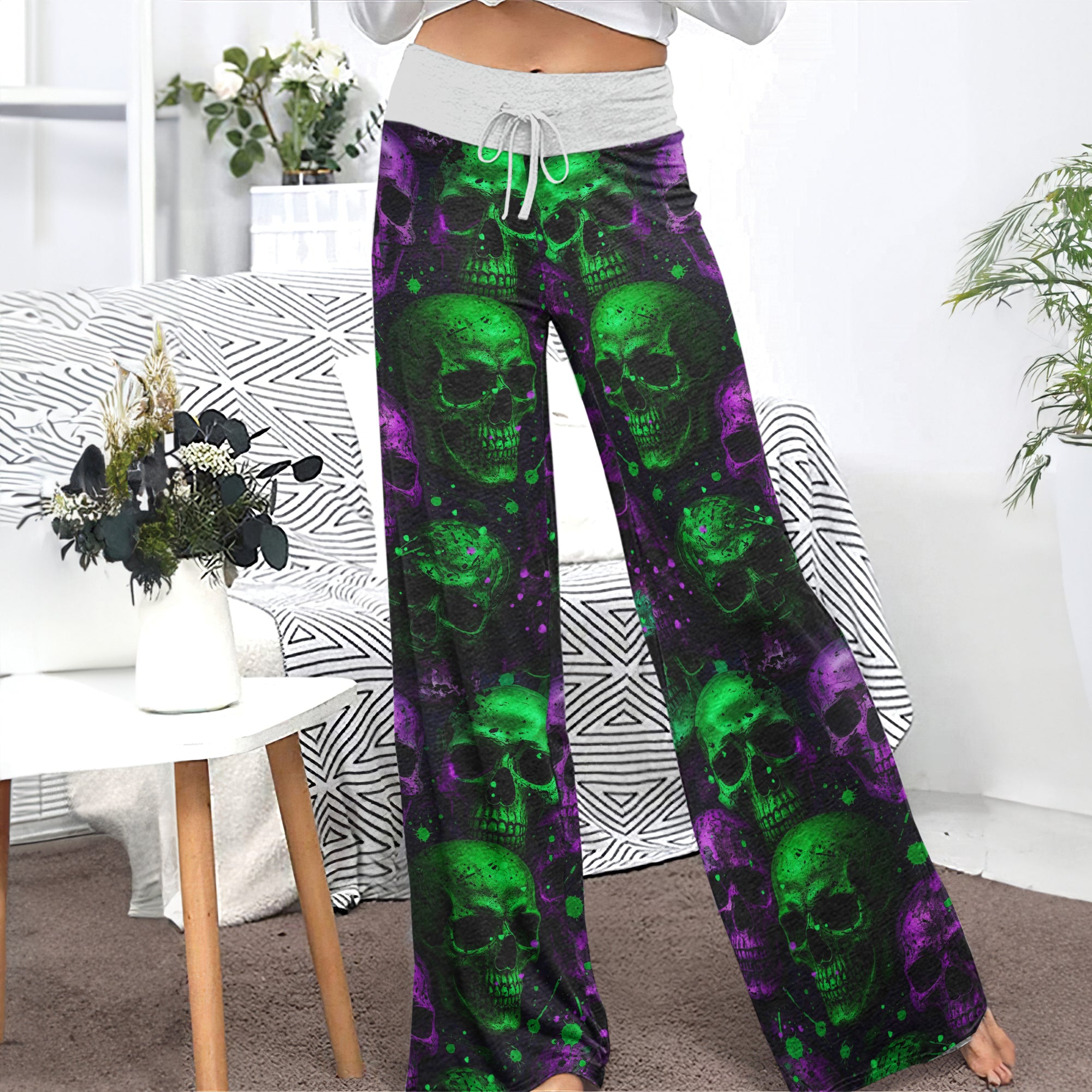 Violet Green Skull Pattern Women's High-waisted Wide Leg Pants