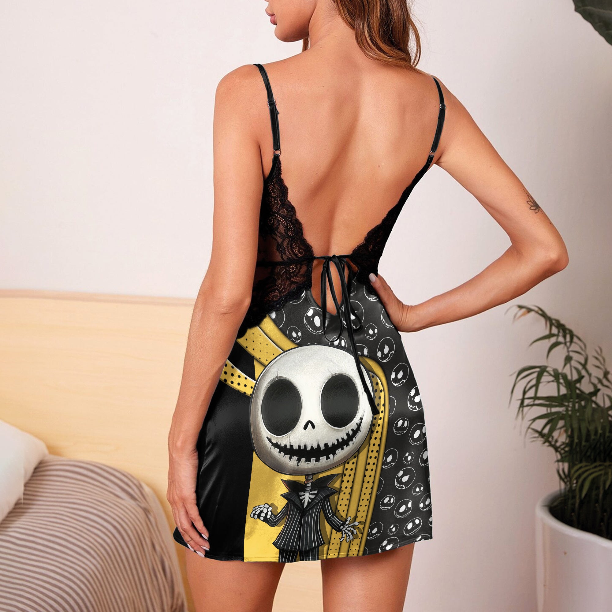 This Yellow Nightmare Artwork Women's Back Straps Cami Dress With Lace is a must-have for any woman who wants to feel confident and stylish, whether she's out on the town or lounging at home.